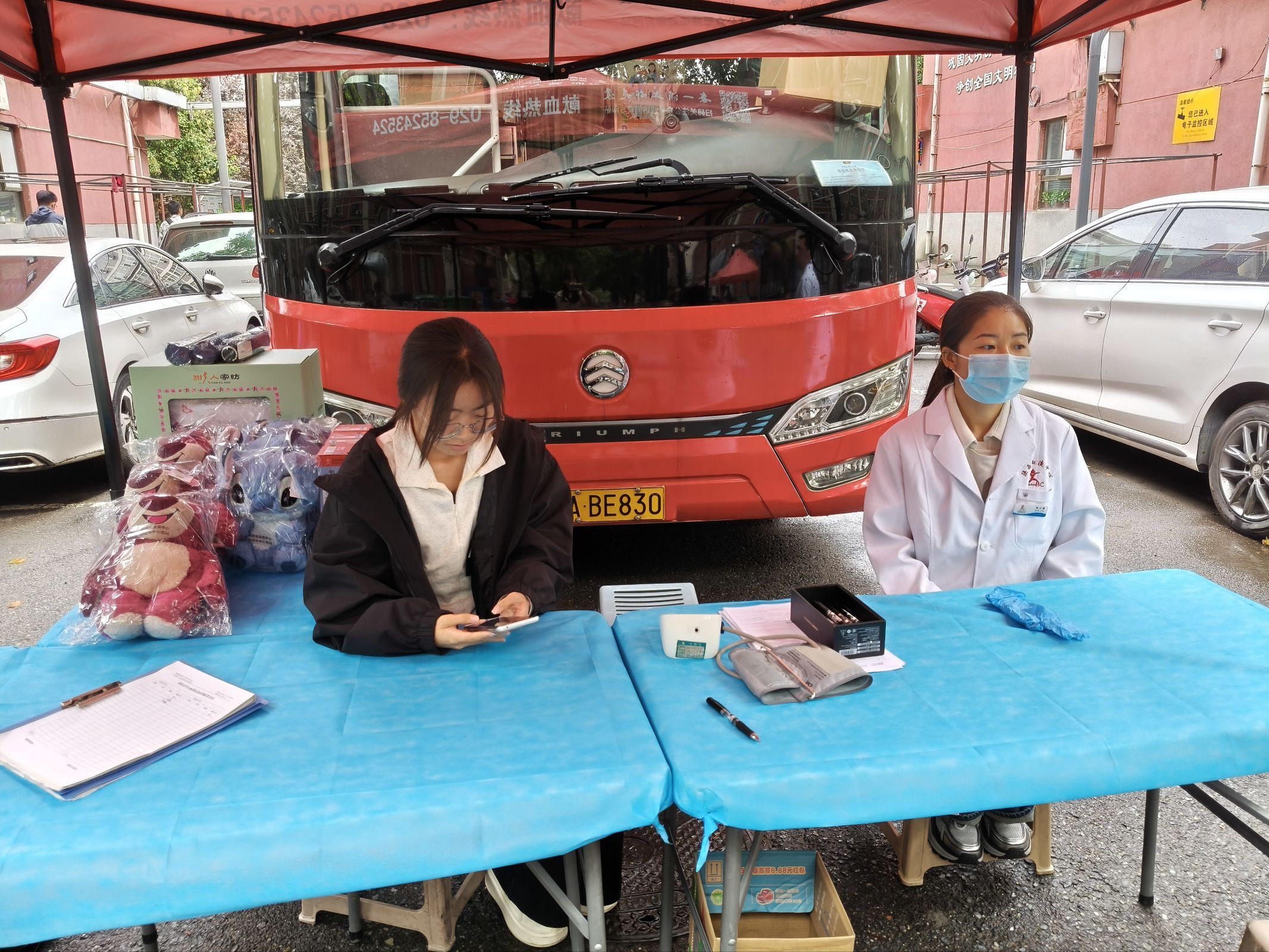 献血结束后,医护人员为每位献血者送上了精心准备的纪念品——实用的保温杯、可爱的毛绒玩偶与舒适的抱枕被等。接过礼物与鲜红的献血证,同学们的脸上露出了满足的笑容。这小小的礼物,不仅是对献血行为的感谢,更是对这份奉献精神的致敬。