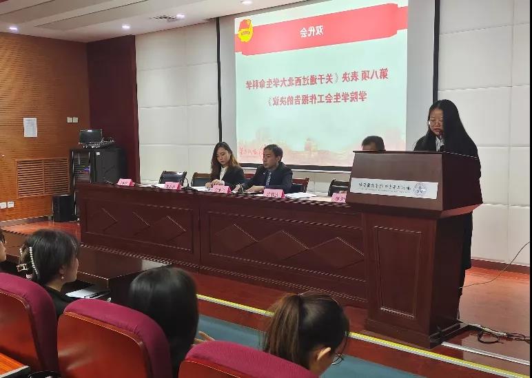 学院党委副书记魏宁代表学院党委对大会的顺利召开表示祝贺,对学生会、研究生会过去一年所做的工作给予充分肯定,并强调了本次大会的重要性,向各位的辛勤付出表示感谢,同时向各位同学提出了以下希望:1.加强学习,坚定理想信念。2.干部带头,深入实践体验调查,积极探索,大胆创新。3.革故鼎新,引领凝聚青年,注重活动内容,调动同学们的积极性,鼓励同学们取得更加优优异的成绩。