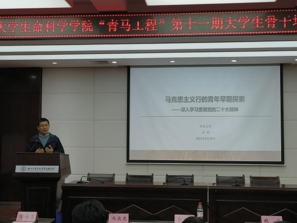 本期“青马工程”培训的第一讲伴随着开班仪式的余温接踵而来,西北大学团委副书记、西北大学马克思主义学院副教授齐钊老师为本期“青年马克思主义者”培训班作了题为“马克思主义行的青年早期探索——深入学习贯彻党的二十大精神”的主题讲座,带领学员们在学习党的伟大建设中,坚定理想信念。