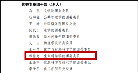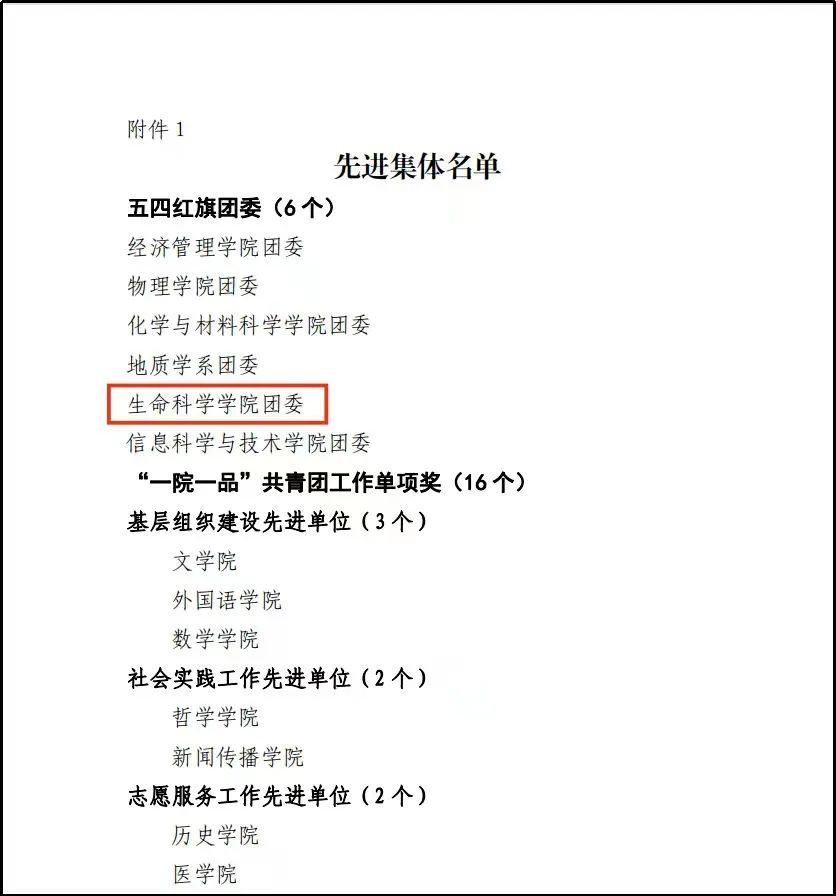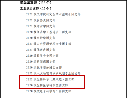 一年来,学部共青团组织踔厉奋发、笃行不怠,在今年学校共青团工作“五四”评比中获得多项荣誉:生命科学学院团委荣获“五四红旗团委”荣誉称号,医学院团委荣获“志愿服务工作先进单位”称号,2021 级生物科学(基地班)团支部与2020级生物医学科学班团支部荣获“五星级团支部”称号,2020级生命科学与技术(基地班)团支部与2021级生物医学科学班团支部荣获“四星级团支部”称号,2021级生命科学与技术(基地班)专业本科团支部、2021级临床医学班团支部与2020级临床医学班团支部荣获“三星级团支部”称号,郭佳惠荣获“优秀专职团干”称号,邓紫月荣获“十佳团支部书记”称号,长孙梓音荣获“优秀学生团干部”称号,马庆缘、周婧等29名团员青年荣获“优秀共青团员”荣誉称号。