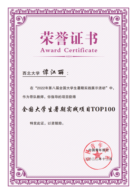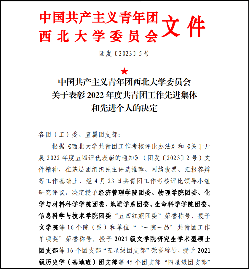 过去的一年里,学部认真贯彻落实党的二十大精神中对青年培养的目标要求,始终秉承和发扬西北大学“公诚勤朴”校训精神,坚持立德树人根本任务,聚焦构建“三全育人”工作体系,涌现出一批青年教师、青年集体的模范代表。“助力乡村振兴,胡蜂防治宣传”项目入选“2022年全国大学生暑期实践项目TOP100”。在近期碑林区、长安区青年评选中,“胡蜂防治”科研团队谭江丽、范铭沁等荣获“碑林青年五四奖章集体”、青年教师刘琼荣获“碑林青年五四奖章个人”、青年教师谭增琦荣获“长安好青年”称号。