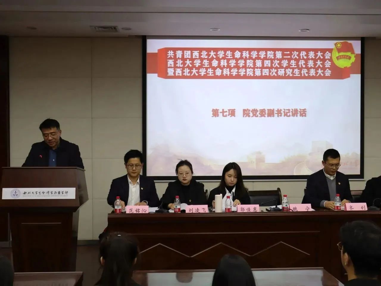 最后,学院党委副书记魏宁向大会的召开表示热烈祝贺。他强调,本次大会的召开,是标志我院团学研工作步入规范化、常态化的一次重要会议,是积极顺应学校和学院综合改革不断深化需要的一次主动作为会议,更是广大青年们共商做好党的助手和后备军,进一步规范和加强自我教育、自我管理、自我服务和自我监督工作的会议。魏宁副书记对大会客观、详实的工作报告表示了肯定,感受到了青年人对工作的积极探索与一腔热情。同时,他提出了三点希望:一是加强理论学习,坚定理想信念。希望新一届团委、学生会、研究生会始终牢记自己的政治使命,把教育青年和引领广大学生牢固树立理想信念,坚定跟党走的信心作为首要任务。二是加强基层建设,凝聚青年力量。希望院团委、学生会、研究生会要健全体系、完善机制、创造环境、锻炼队伍,把各项工作融入到每一个学生的成长进步之中。三是创新工作方法,增强生机活力。希望新一届的院团委、学生会、研究生会主席团要认真履行引领凝聚青年、组织动员青年、联系服务青年的职责,团结带领学院广大青年在学院人才培养工作中不断贡献青春力量!作为生科学子,生逢其时,重任在肩。各位同学要脚踏实地、艰苦奋斗、积极探索、大胆创新,将小我融入大我,竭力推动学院改革发展事业,为学校“十四五”规划和“双一流”建设各项目标的顺利实现贡献力量!