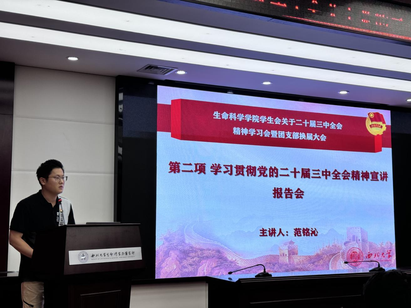 10月17日晚,学院学生会关于党的二十届三中全会精神学习会暨团支部换届大会在太白校区博望报告厅举办。会议由学院团委副书记范铭沁主持,学生会全体成员参会。