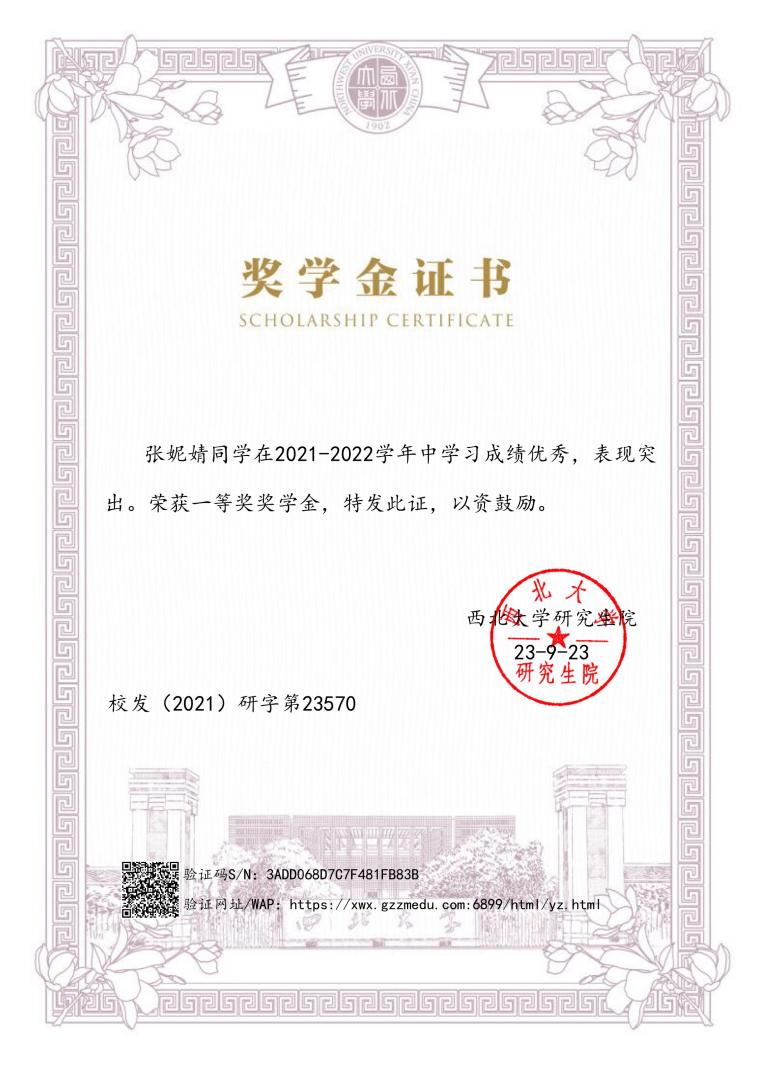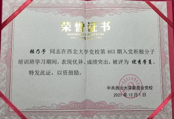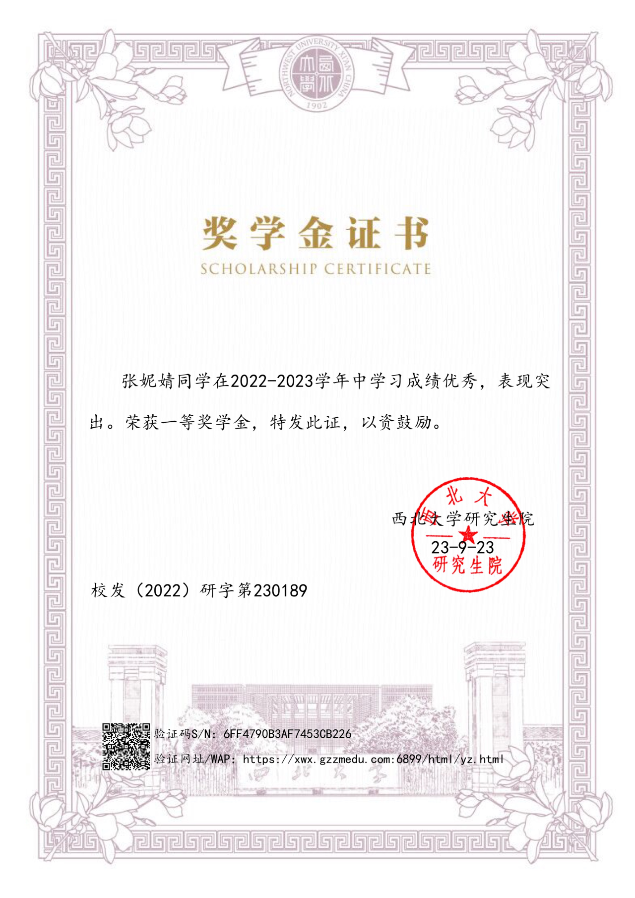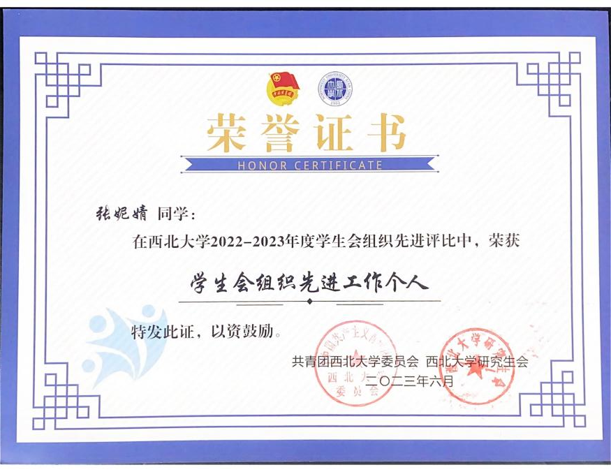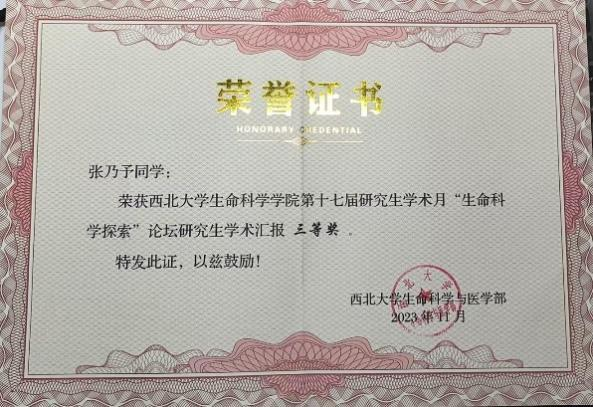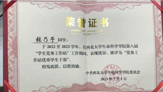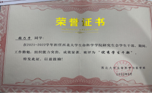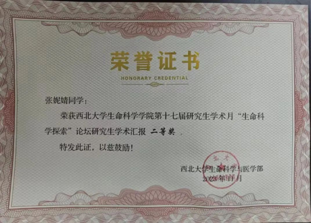 张妮婧,女,在学习上,努力刻苦,勤奋认真,不断精进自己的专业知识与科研能力。曾多次获得校一、二等奖学金,在生命科学学术汇报月活动中获二等奖,并且以二作身份发表SCI论文(IF=5.6)。研究生期间为校研会组织发展部的负责人,积极参与组织多项校园活动,致力于促进学生的全面发展和校园文化建设。同时协助研究生迎新、毕业生图像信息采集、太白校区研究生招生考试工作。在完成工作的过程中认真倾听同学们的意见和建议,及时调整工作重点,努力做好每一项工作,2023年获“学生会组织先进工作个人”称号。现已签约至汉中市龙岗中学。