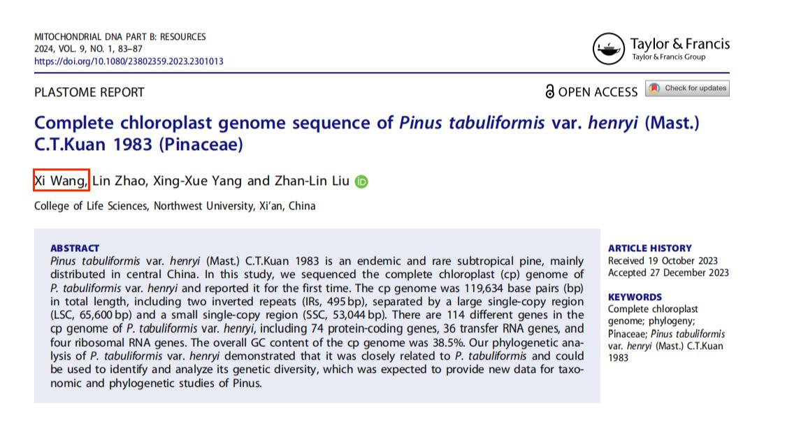 王茜,女,中共党员。思想方面,坚决拥护党的各项方针和政策,时刻以一名党员的标准严格要求自己;学习上,我刻苦努力,在4月初参加陕西省植物学会并作汇报,最终获得陕西省优秀学术论文二等奖。5月初参加全国系统与进化会议并作展板。同时还参加了次生代谢产物poster大赛。共发表学术论文两篇,以第一作者在Industrial crops and products期刊发表《Multi-omics profiling reveals an extensive regulation network shift in the domestication process of the traditional Chinese medicinal herb Rehmannia glutinosa Liboschitz (Orobanchaceae)》(SCI一区top),同时以第一作者发表《Complete chloroplast genome sequence of Pinus tabuliformis var. henryi (Mast.) C.T.Kuan 1983 (Pinaceae)》(SCI 四区);社会实践方面,我担任了党务工作站副站长、抖音部干事以及舍长等多项职务,认真负责,同时积极参加各种社会活动。目前签定江苏省无锡市人才引进教师编合同。