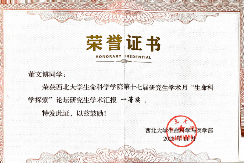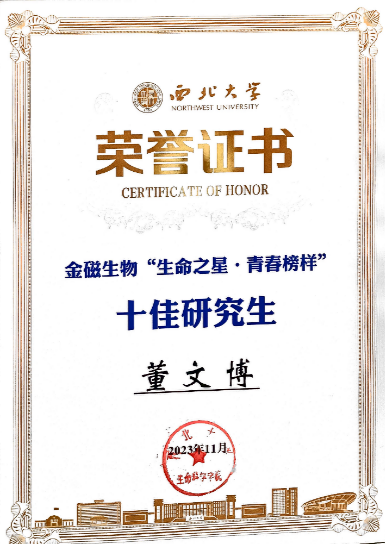 董文博,男,1999年7月生,437437必赢国际网址2021级生物技术与工程专业硕士。2021年至今,师从孙士生教授开展基于质谱的糖蛋白质组学的方法学研究,三年以来,以踏实、上进、积极的态度面对研究生的科研生活。硕士期间,发表SCI论文4篇,其中以第一作者发表二区、三区SCI论文各一篇,以第三作者发表一区TOP SCI论文一篇,以共同作者发表四区SCI论文一篇;获西北大学一等奖学金两次,二等奖学金一次;获2022-2023学年生命科学学院“生命之星·青春榜样” 十佳研究生;获437437必赢国际网址第十七届研究生学术月“生命科学探索”论坛研究生学术汇报一等奖;获西北大学2024届优秀毕业生;并先后担任生命科学学院生物工程第一党支部宣传委员、纪检委员各一年。