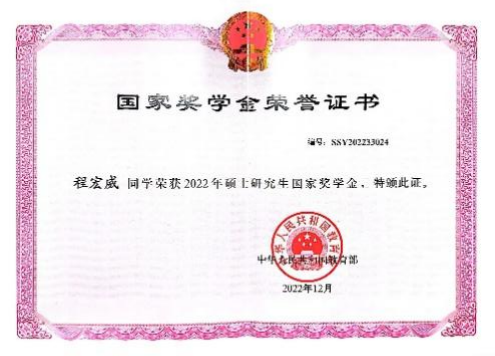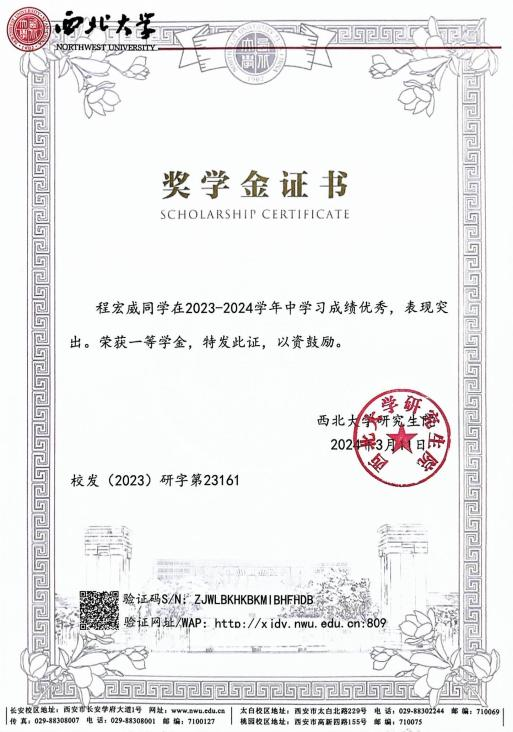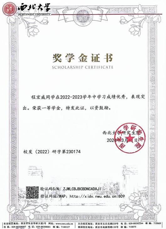 程宏威,曾获2022-2023学年硕士研究生国家奖学金,2022-2023学年西北大学一等奖学金,2023-2024学年西北大学一等奖学金,2022-2023学年生命科学学院“3+2”篮球比赛冠军,2022-2023学年西北大学健康杯排球比赛冠军,2022-2023学年暑假三下乡社会实践活动优秀团队称号,2022-2023学年校园工艺主题摄影大赛优秀个人称号,2022-2023学年生科院“光影寄情忆芳华,礼献新篇迎双甲”摄影大赛优胜奖,2022-2023学年第八届中国国际“互联网+”省级银奖。获得专利一项:五羟色胺-二氧化硅微球复合物及其制备方法、唾液酸化糖萼蛋白提取工艺,202311106741.3,第二发明人(仅次于导师),2023.08,发表论文五篇。现准备投身于自研护肤品的孵化与转化,专注于公司的创立与产品上市工作。