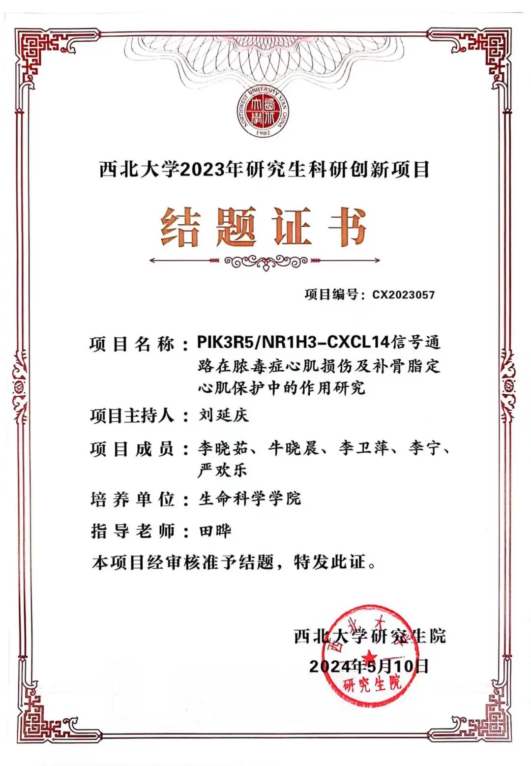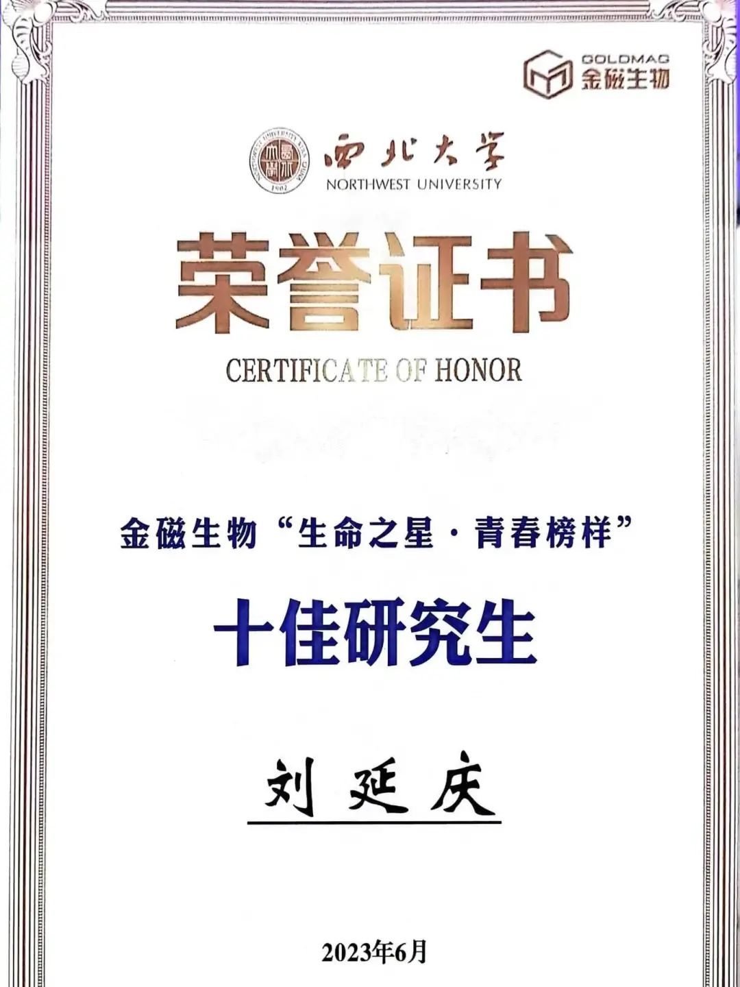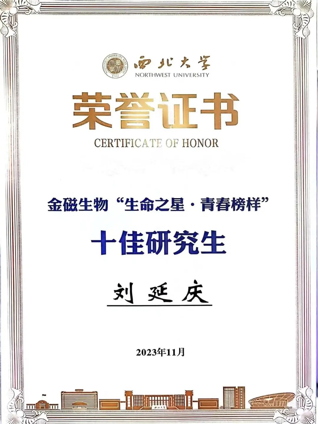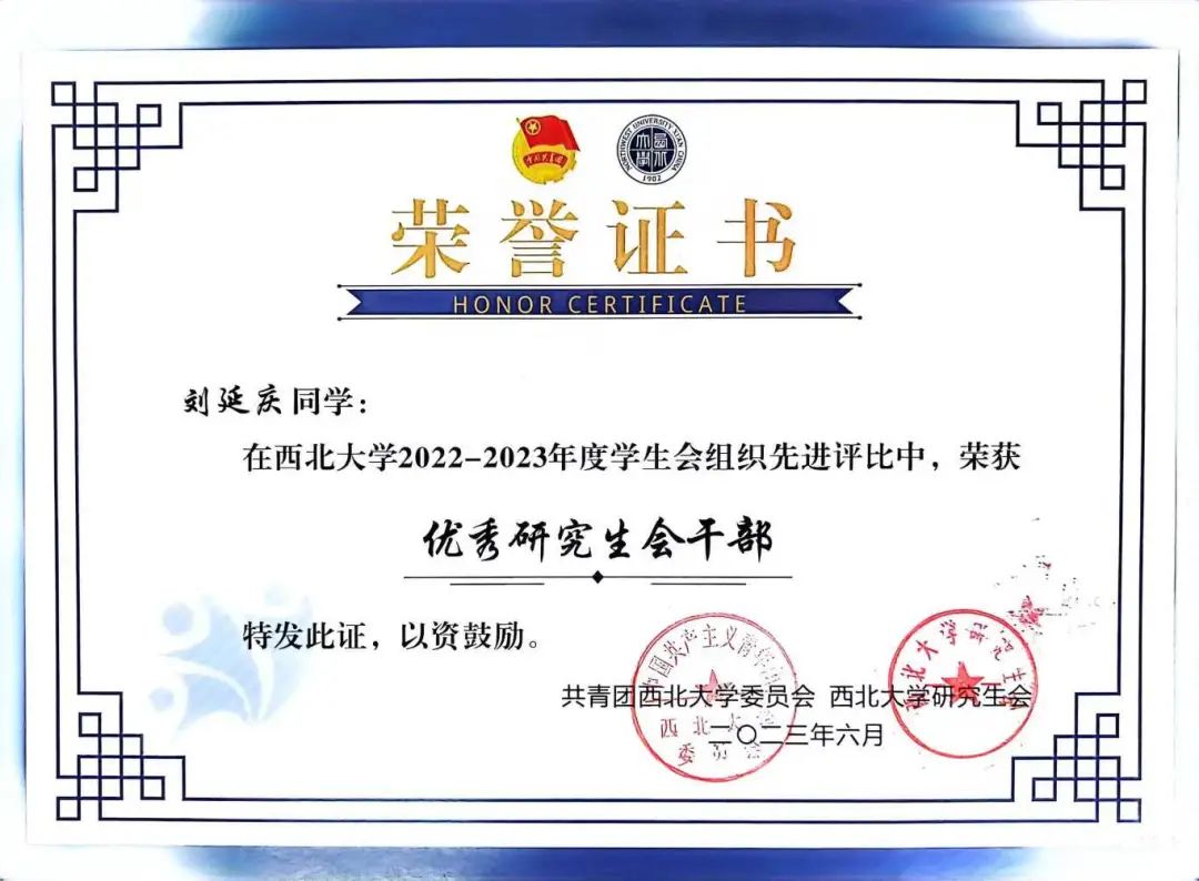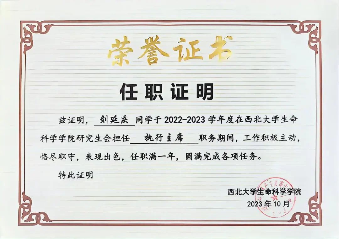 在研究生期间刘延庆尝试参与了学生工作。他曾担任2021硕士第五团支部书记,437437必赢国际网址研究生会执行主席。在担任团支书期间,刘延庆在团委的刘凌飞老师帮助下学着处理相关事宜,在工作中提升自己的能力。在担任主席期间,他曾在生命科学学院团委张芝榕老师和郭佳惠老师的带领下统筹日常学术讲座、木香学术沙龙、青年学者讲坛、学术活动月、实验室安全文化月各项活动共计83场,活动反响良好。生命科学学院研究生会荣获2023年度西北大学标兵研究生分会。