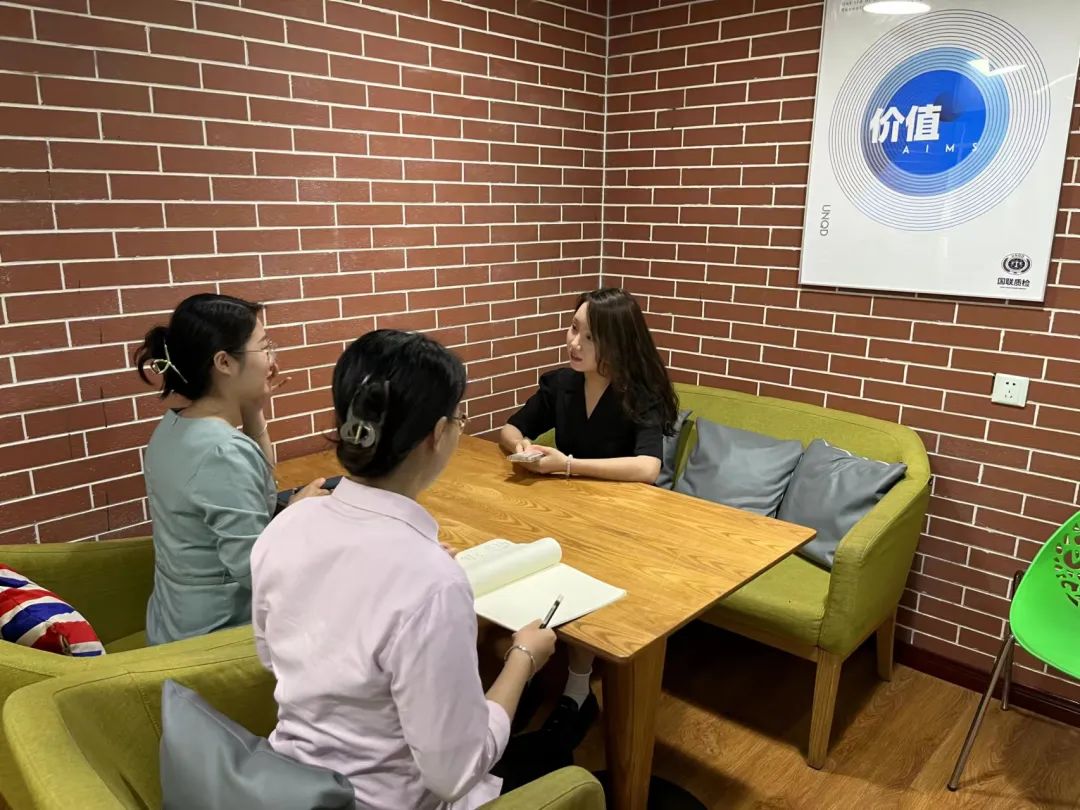 参观结束后,魏宁副书记、郭佳惠老师与国联质检人事经理杨青、品牌经理杨思梦、HR党华英进行座谈,围绕企业产业链、运营模式、人才需求、实习见习、薪资待遇等展开深入探讨,达成人才供需对接长期合作意向;参访毕业生主动向企业人事递上个人简历,进行了初步意向交流,为下一步的双方校企合作与毕业生就业工作奠定了良好基础。