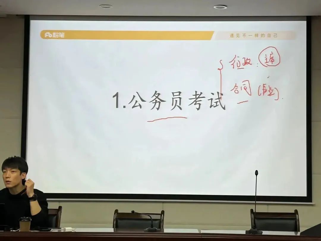 下午,贺垚老师以公务员考试行测科目为题,首先强调了行测考试的重要性和出题特点,随后针对行测各个部分的知识点进行了详细梳理分析,深入浅出帮助同学们理解行测科目的重点与难点,结合考试例题,切实分享了对应知识点的解题技巧,并提出同学们可通过分模块复习、错题积累、多做模拟题等形式高效备考。最后,他与现场同学展开互动交流,针对大家在备考过程中遇到的问题进行了详细解答。