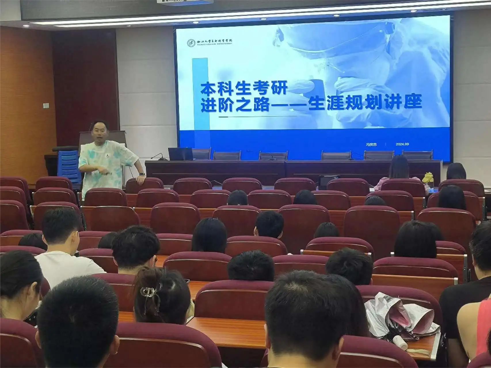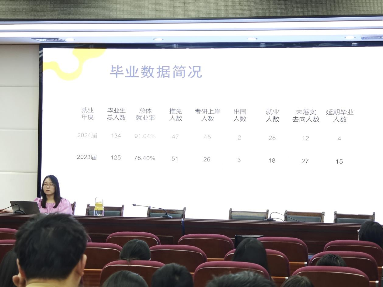 为帮助2025届本科毕业生进一步了解升学、求职形势与政策,明确努力路径,明晰毕业方向,2024年9月27日中午,学院于博望报告厅举办2025届本科毕业生升学、求职推进会,团委书记冯奕忠老师、就业专干郭佳惠老师针对升学、就业等问题进行指导动员,2025届本科毕业生100余人参会。