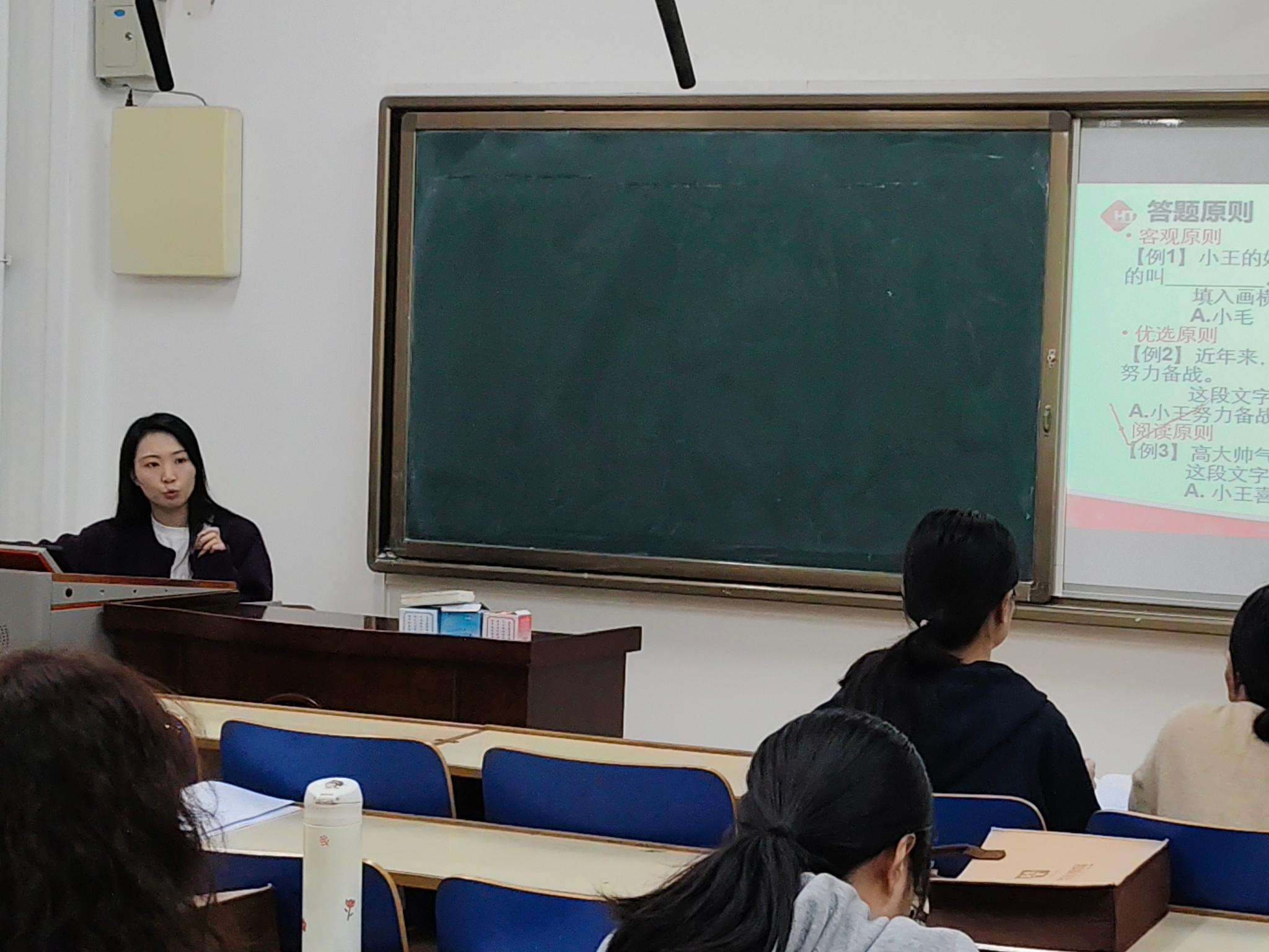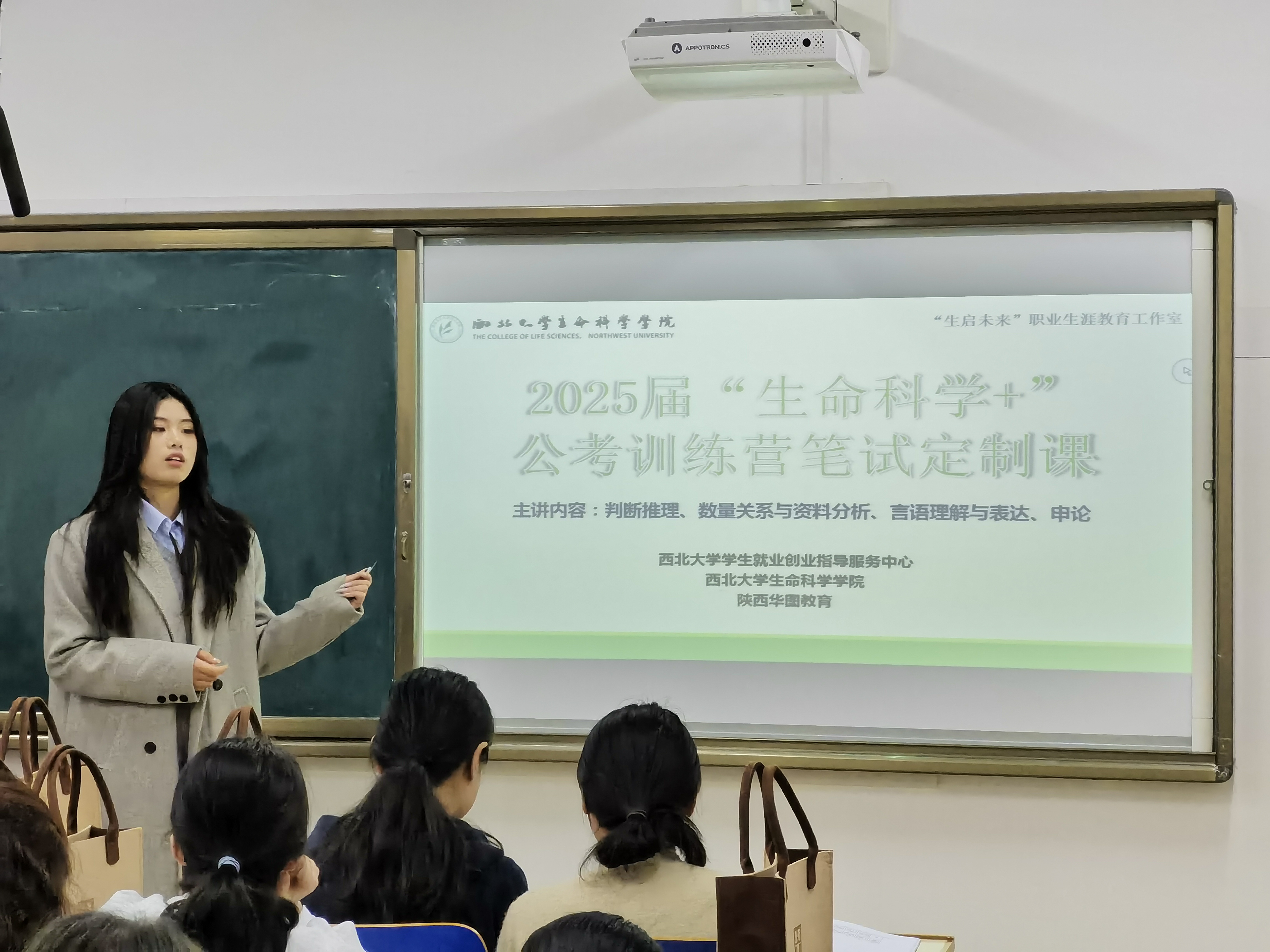 为进一步助力2025届毕业生掌握公考应试技能,有效提升毕业生的就业竞争力,推动毕业生多元化高质量就业,11月9日-10日,由“生启未来”职业生涯教育工作室组织,学院联合陕西华图教育举办2025届“生命科学+”公考训练营笔试定制辅导。课程为期两天,邀请华图资深师资李向龙老师、张昭辉老师、郭瑞老师、郑美莹老师,分别针对判断推理、数量关系与资料分析、言语理解与表达、申论开展辅导,30余名毕业生到场参加。