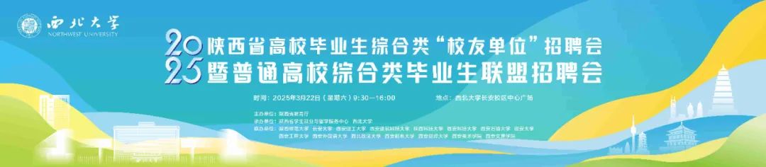 为构筑优质用人单位与精英学子高效互动桥梁,拓宽卓越职业发展路径,紧抓春招黄金时机,确保2025届毕业生高质量就业,“2025陕西省高校毕业生综合类‘校友单位’招聘会暨普通高校综合类毕业生联盟招聘会”定于2025年3月22日(星期六)在西北大学长安校区盛大启幕。届时,各大知名企业将携海量岗位与各高校的杰出毕业生共聚一堂,精准匹配,共筑未来。