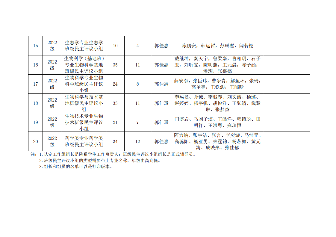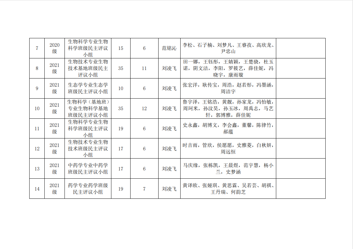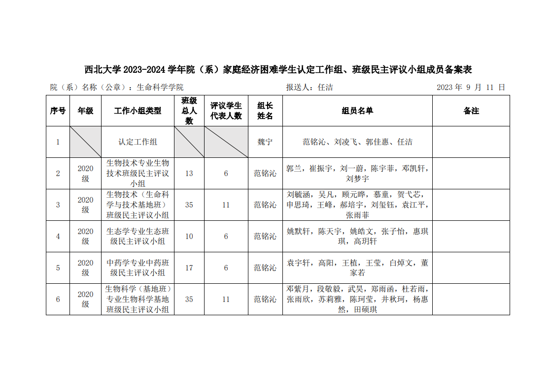 生命科学学院2023年本科生家庭经济困难学生认定工作组、班级民主评议小组成员公示名单