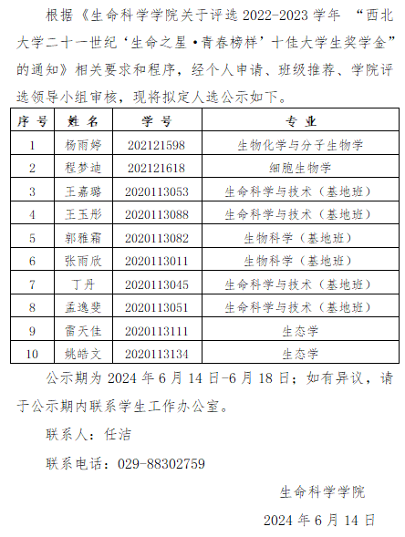 生命科学学院2022-2023学年 “西北大学二十一世纪‘生命之星·青春榜样’ 十佳大学生奖学金”拟推荐名单公示