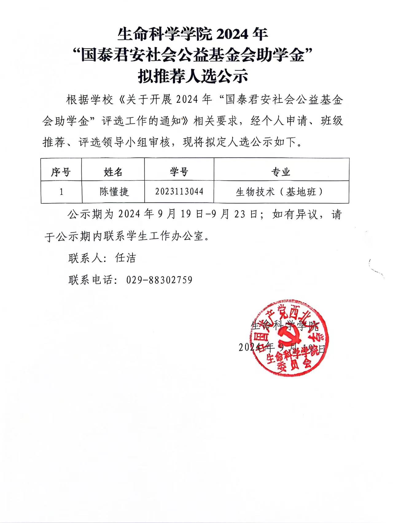 生命科学学院2024年“国泰君安社会公益基金会助学金”拟推荐人选公示
