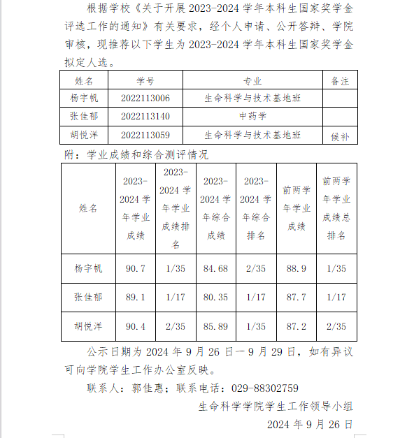 生命科学学院2023-2024学年本科生 国家奖学金拟推荐名单公示