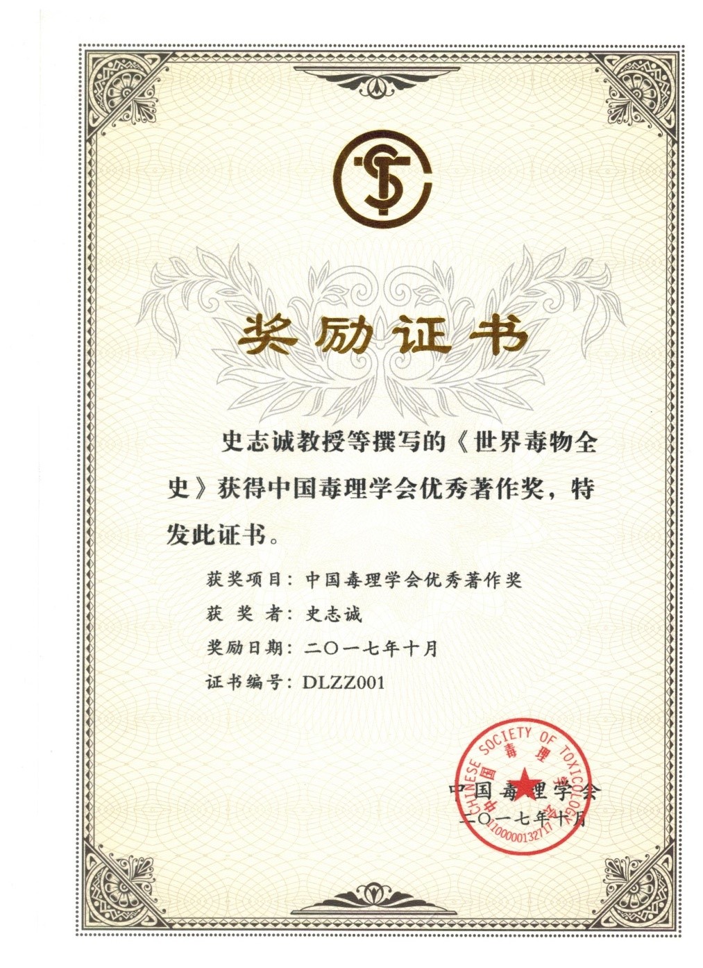 史志诚教授从事毒理学研究40多年,现任西北大学生态毒理研究所所长,陕西省毒理学会理事长,国际毒素学会(IST)会员。其研究成果积极响应了习近平总书记提出的“文化自信、文化强国”新理念,有力推动了国际科学史和毒物科学史的研究进展,是我校在毒理学研究领域取得的重大成果,为推进我校的“双一流”建设作出了积极的贡献。