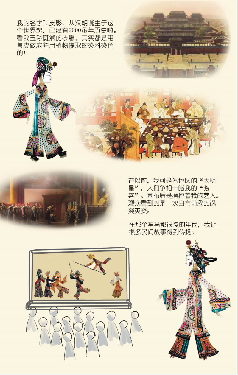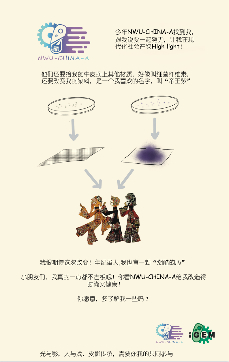 此外,团队成员还做了一个大胆的尝试:将“帝王紫”与陕西的皮影文化有机融合,他们在前期走进地方深入调研了皮影文化,了解其市场发展及行业动态,将所获成果以讲座报告的形式向公众推广。