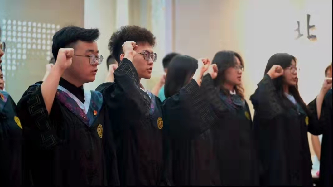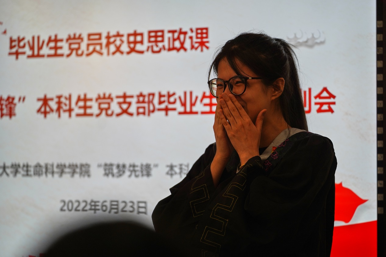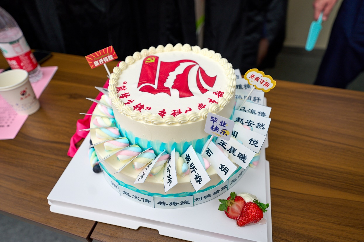 会议伊始,毕业生党员代表赵安然带领与会人员面向鲜红的党旗重温入党誓词,“我志愿加入中国共产党,拥护党的纲领,遵守党的章程......”,毕业生党员在毕业之际再次举起右拳庄严宣誓,一字一句铿锵有力,共同追溯入党初心。随后,大家共同观看短片《红色基因是你最鲜亮的底色——给2018级毕业生党员的一封信》,回顾了四年来在党组织内的成长与蜕变。王诗益、郝嘉悦等8位毕业生党员代表分享“我的筑梦时光”,回忆了在母校度过的美好时光,表达了对母校教育、党组织培养的感激之情,纷纷表示,会牢记母校教诲,在新的征途上继续不懈奋斗,担起时代重任。临别之际,毕业生与师长、学弟学妹互赠寄语,共忆校园时光,展望美好未来。常江副校长等和学生党员共同切开毕业蛋糕,并为同学们发放毕业纪念品,此次毕业纪念品由“筑梦先锋”本科生党支部低年级党员精心设计准备,包括支部徽章、定制笔记本、定制帆布袋以及《习近平和大学生朋友们》一书,希望毕业生党员始终牢记习近平总书记对青年一代的殷切期望,努力成长为有理想、敢担当、能吃苦、肯奋斗的新时代好青年,用奋斗践行“请党放心、强国有我”的青春誓言。