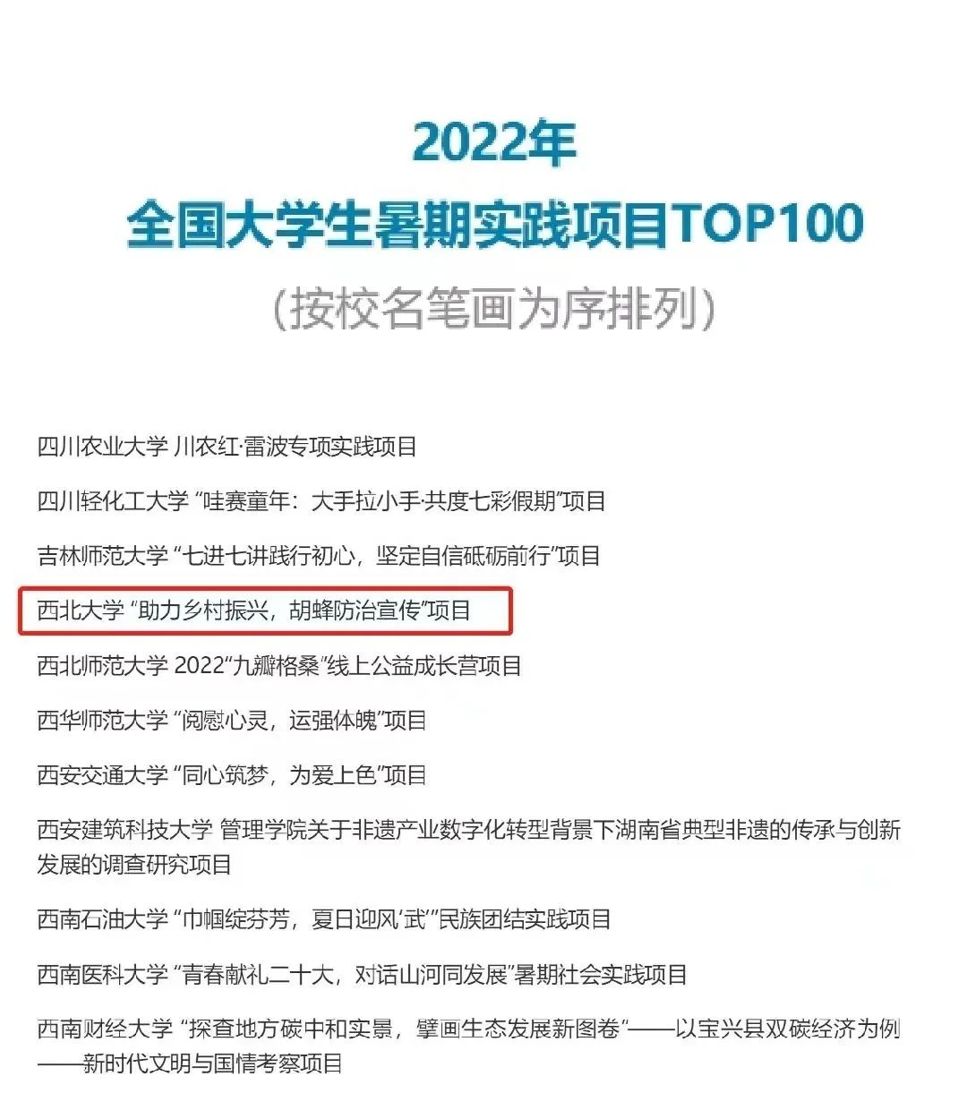 近日,由中国青年报举办的“2022年第八届全国大学生暑期实践展示活动”名单揭晓,我校生命科学学院“助力乡村振兴,胡蜂防治宣传”项目入选“2022年全国大学生暑期实践项目TOP100”。