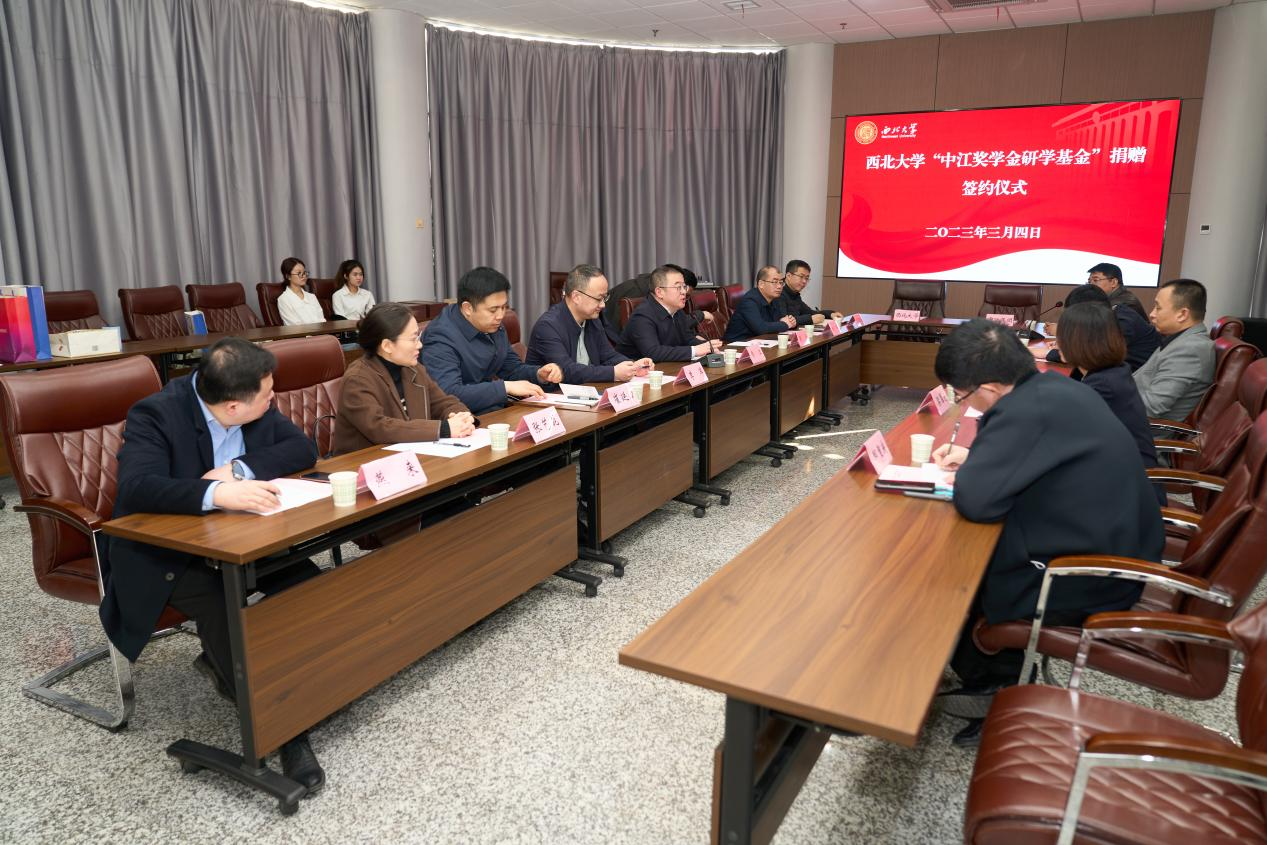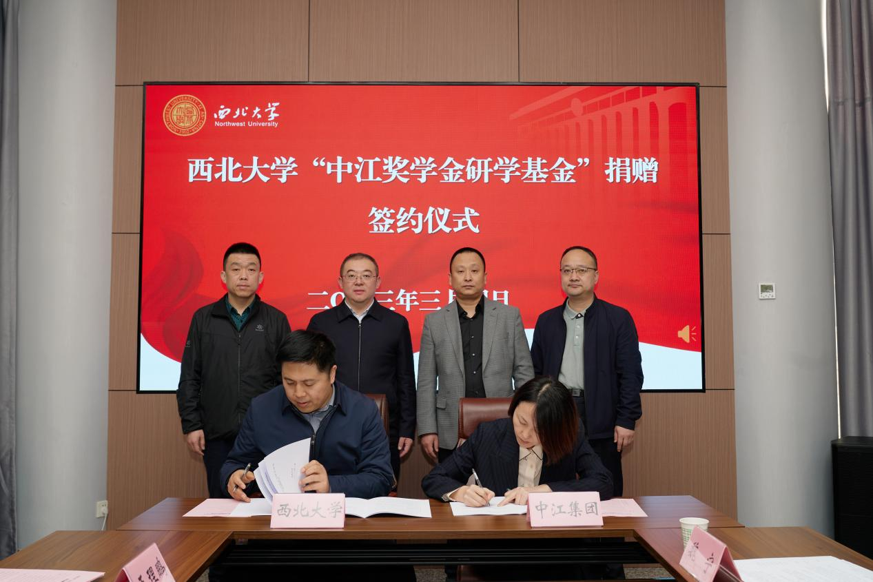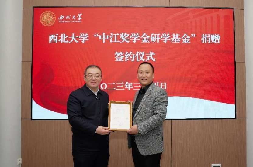2023年3月4日上午,西北大学“中江奖学金研学基金”签约捐赠仪式在太白校区举行。校党委常委、副校长常江,北京爱心企业家冉江涛、梁翠丹,校友郝重庆出席仪式,国内合作与校友工作处处长崔延力、研究生工作部部长李军、医学院书记张宇、学生工作部副部长王理鹏、碳中和学院负责人谢钢、国内合作与校友工作处副处长张艺昆、燕来参加。生命科学学院党委副书记魏宁主持仪式。