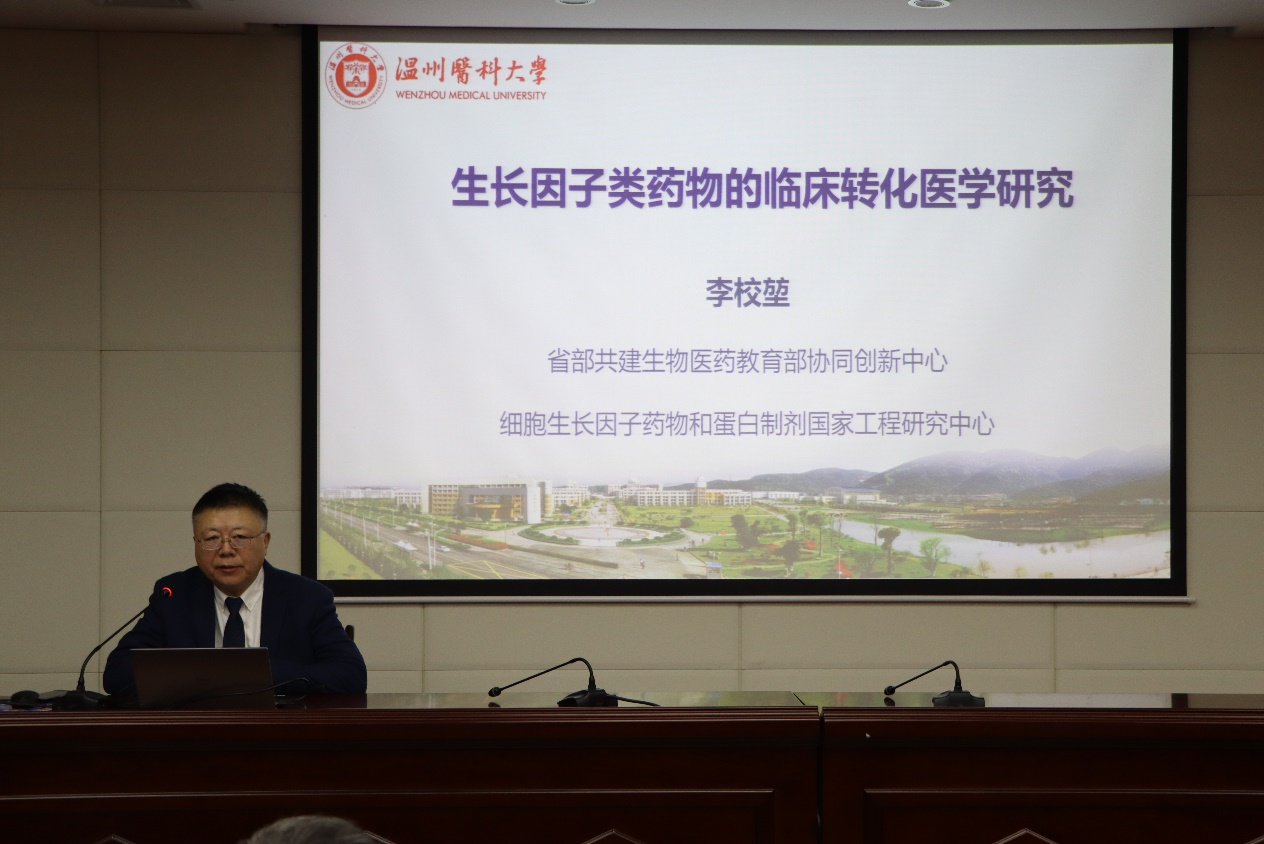 李校堃院士最新的研究聚焦FGF对机体代谢稳态的调控作用,表示该研究为非促增殖代谢调控FGF变构体的定向改造、代谢疾病新靶点的发现和新药物的开发提供了重要的理论依据。报告中,李校堃院士对FGFs在人类生长发育过程中发挥的作用进行了系统的阐释,并强调了FGFs的临床转化价值。他指出,FGF创面给药不会引起癌变、不会导致瘢痕增生,能够加速慢性难愈创面主动修复和功能再生,为各类难愈性创面提供了治疗新策略。最后,李校堃院士向师生们简要介绍了温州医科大学和再生调控与眼脑健康浙江省实验室的建设发展情况。