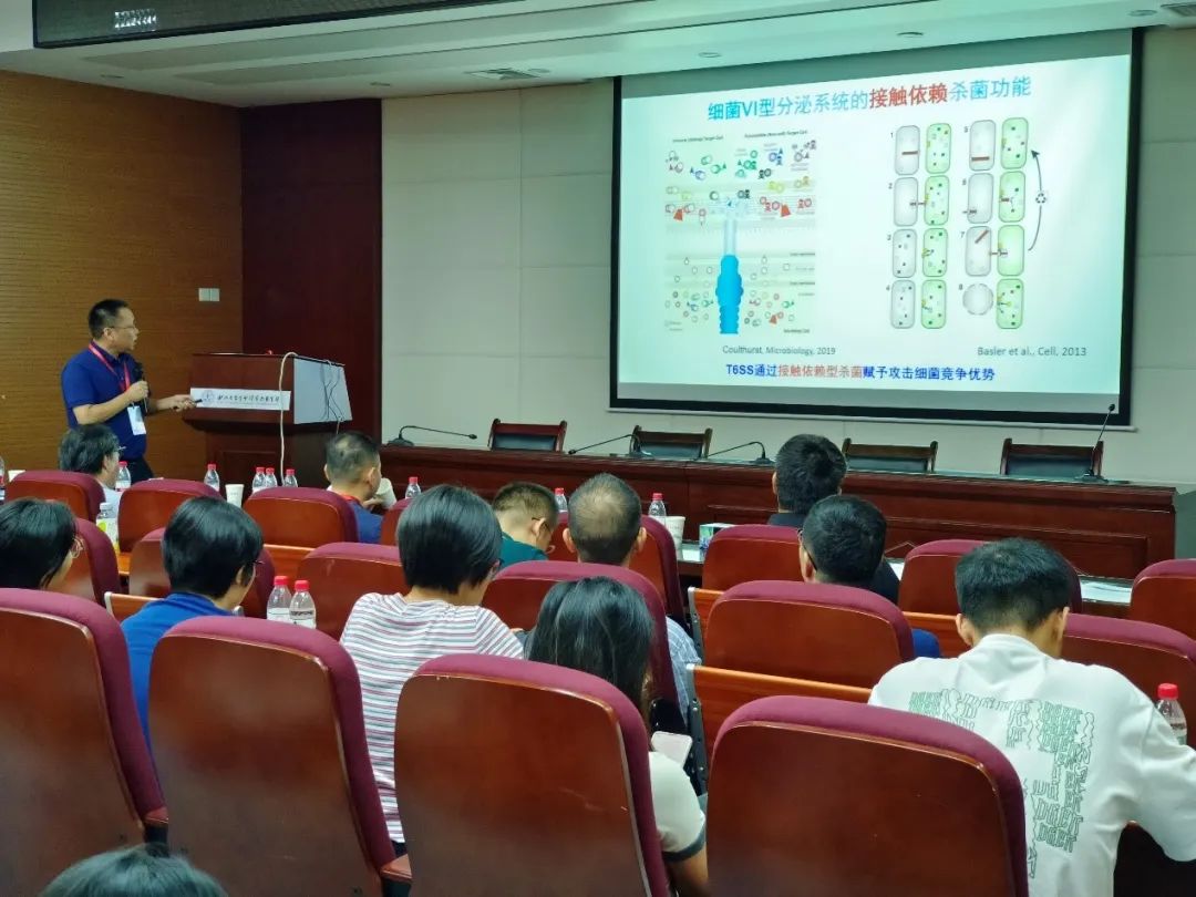 沈锡辉教授介绍了细菌六型分泌系统的接触依赖杀菌功能,课题组研究发现细菌六型分泌系统分泌一个含转录因子结构域的FIC毒素CccR,CccR通过外膜受体蛋白FhuA进入靶标细菌,FhuA介导CccR的毒性和非接触竞争功能,CccR通过AMP化修饰FtsZ抑制细菌分裂,对CccR的调控蛋白功能验证发现CccR可进入其他细胞发挥调控蛋白的功能。报告还介绍了细菌六型分泌系统的多种功能如非接触杀菌功能、细胞通讯功能、抗宿主天然免疫功能、外膜囊泡招募功能。