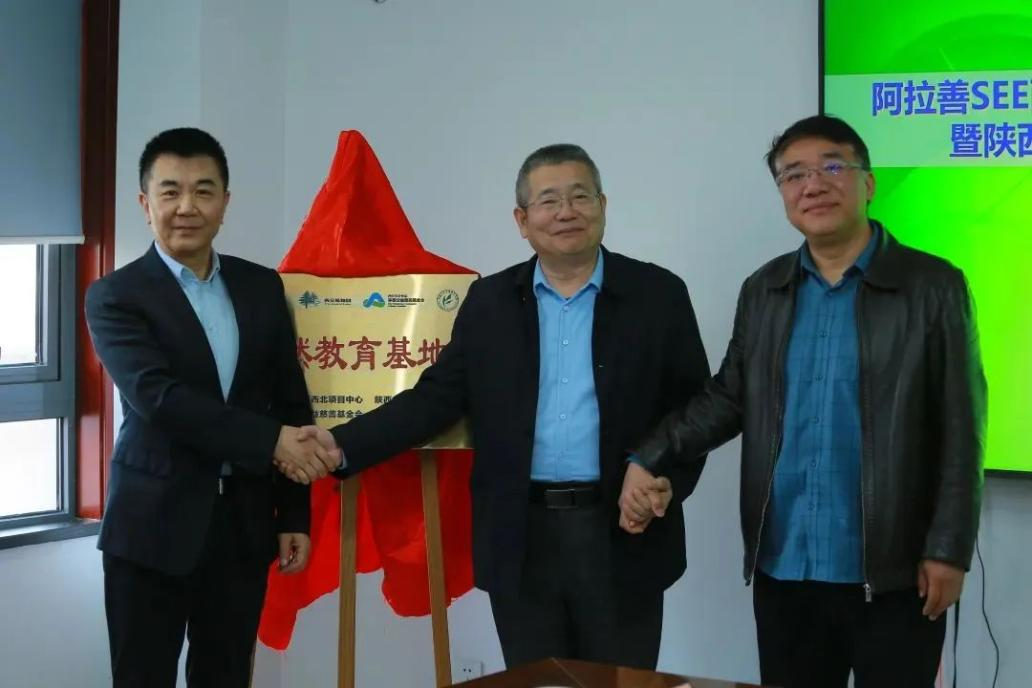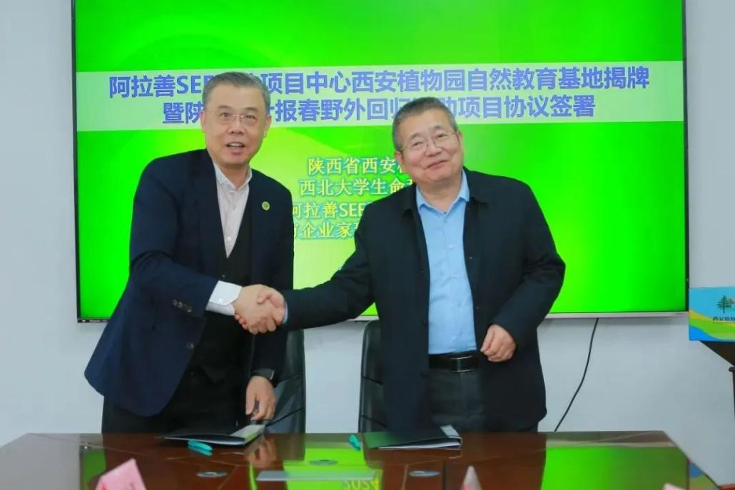 随后,西安市企业家环保基金会理事长王辉和西安植物园主任岳明签署“陕西羽叶报春野外回归项目”资助协议,阿拉善SEE西北项目中心邹斌主席、西安市植物园岳明主任教授、437437必赢国际网址党委副书记魏宁共同为自然教育基地揭牌。