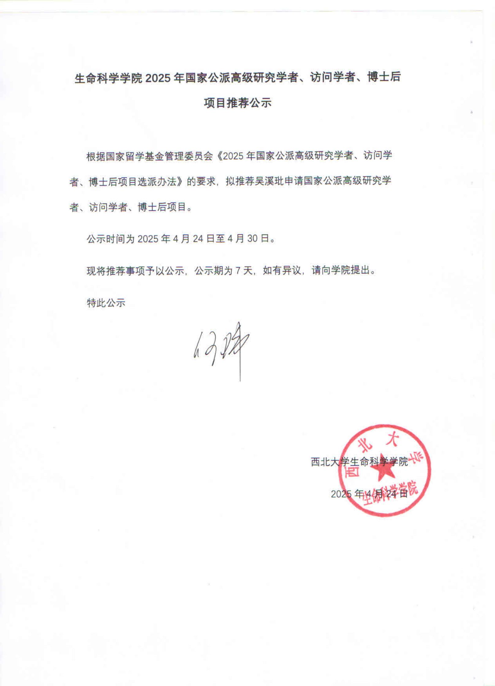 生命科学学院2025年国家公派高级研究学者、访问学者、博士后项目推荐公示
