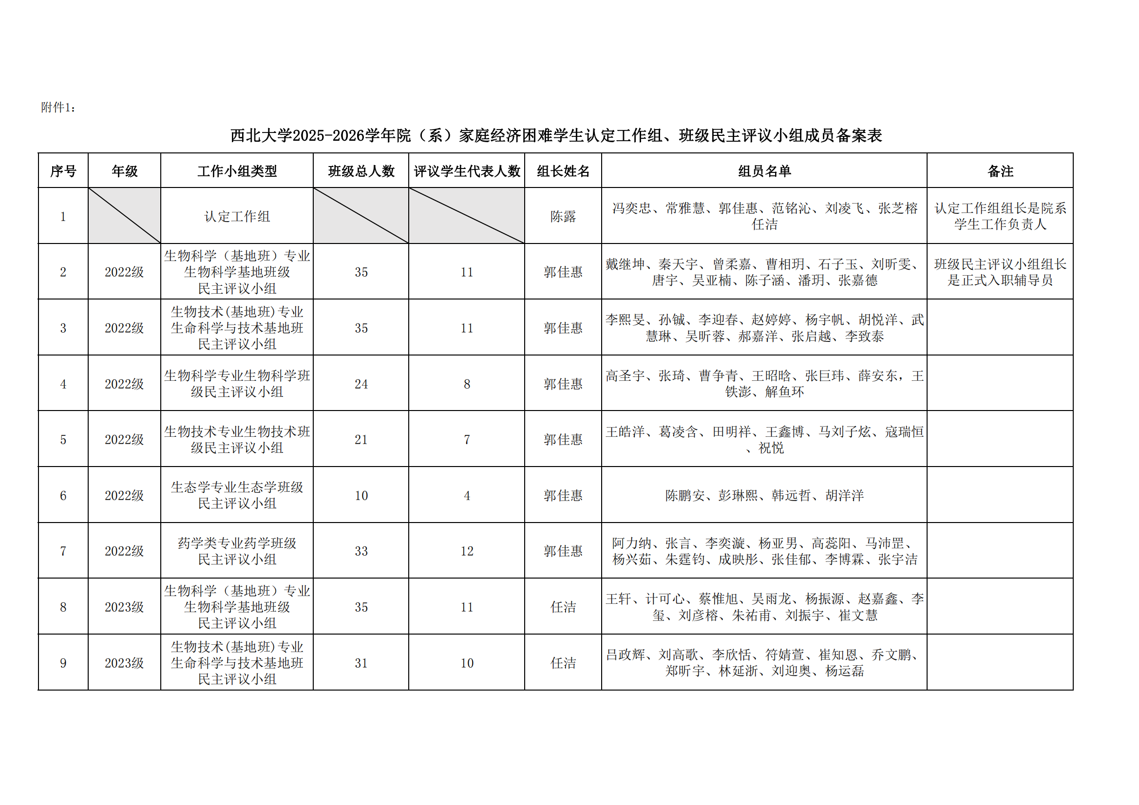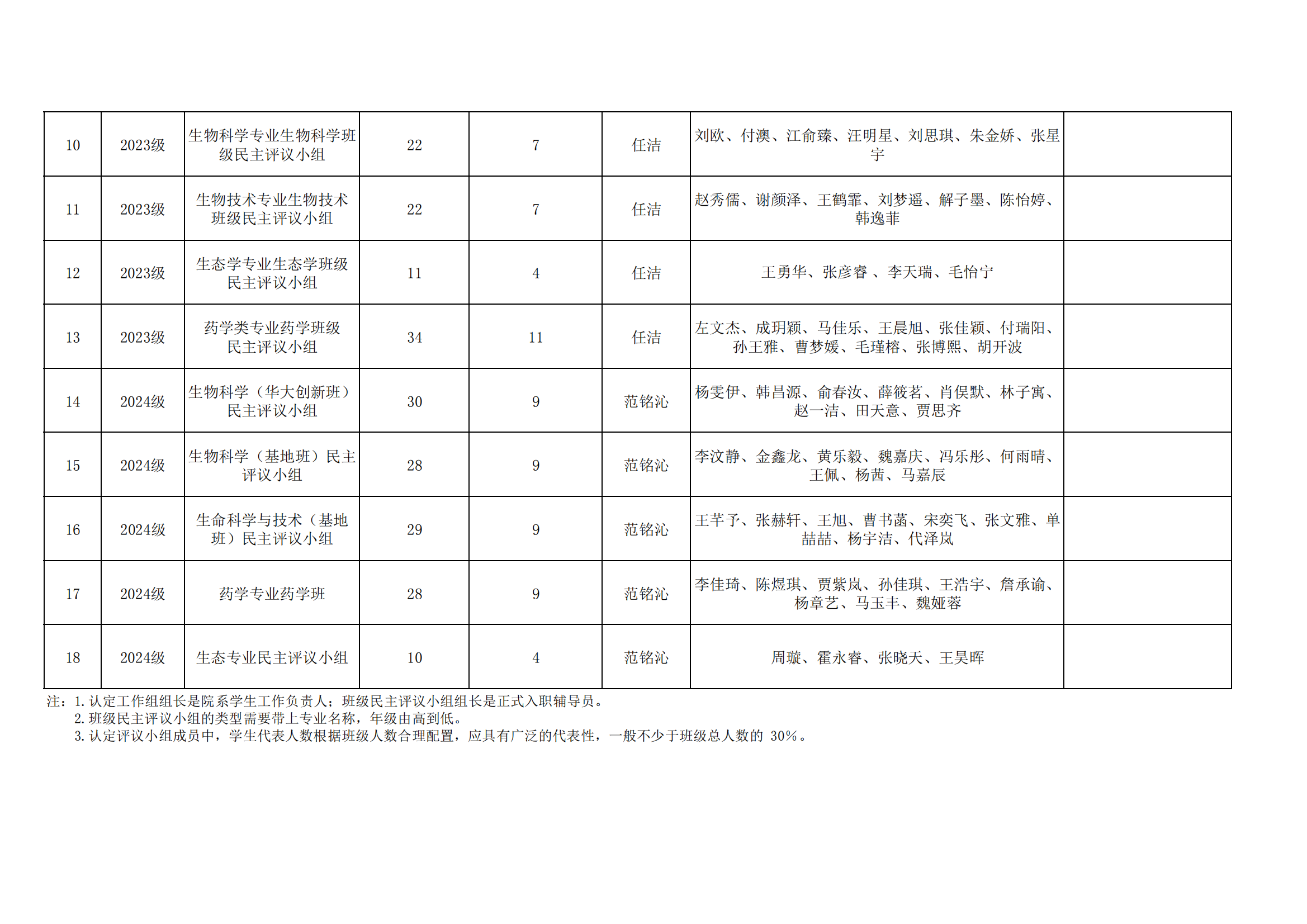 2025-2026学年生命科学学院2022-2024级本科生家庭经济困难学生认定工作组、班级民主评议小组成员公示名单