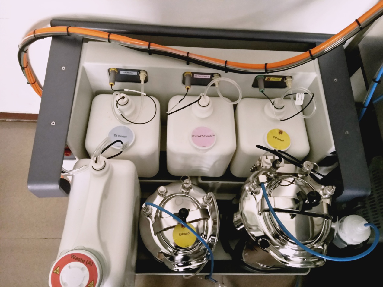 仪器基本信息表 设备名称 分选式流式细胞仪 品牌型号 FACSAria Ⅲ 生产厂商 美国BD公司(Becton,Dickinson and Company) 购买价格 373500美元 购置日期 2017-3-7 主要技术指标 光路系统:激光器488nm、633nm、375nm 支持多达18色20参数检测 液流系统:Auto Clean自动无菌清洗 70,85,100,以及130µm四种规格喷嘴可更换 分析性能:FITC<85 MESF PE<29 MESF CV<3.0%(全峰宽) 分选性能:分选方式:两路 四路 分选速度:70000事件/秒 分选活性:细胞分选后数天内保持良好活性分选纯度:>98%,得率>80%泊松分布 FACSTMAccudrop自动精确确定液滴延迟时间 仪器实景照片 石英流动池与喷嘴 有四种尺寸的喷嘴可选,70µm,85µm,100µm以及130µm,不同尺寸的喷嘴可分选不同大小的样本颗粒。 独立液流车 独立的液流车用于向流式细胞仪提供鞘液、清洗液,并收集废液。液流车自行提供空气压力和真空状态,适合各种细胞的分选应用。 四路分选收集仓 细胞离开喷嘴后经过有电偏转的分选装置,能够对细胞进行更高效和重复更好的定向偏转,并准确进入特定的分选收集装置。