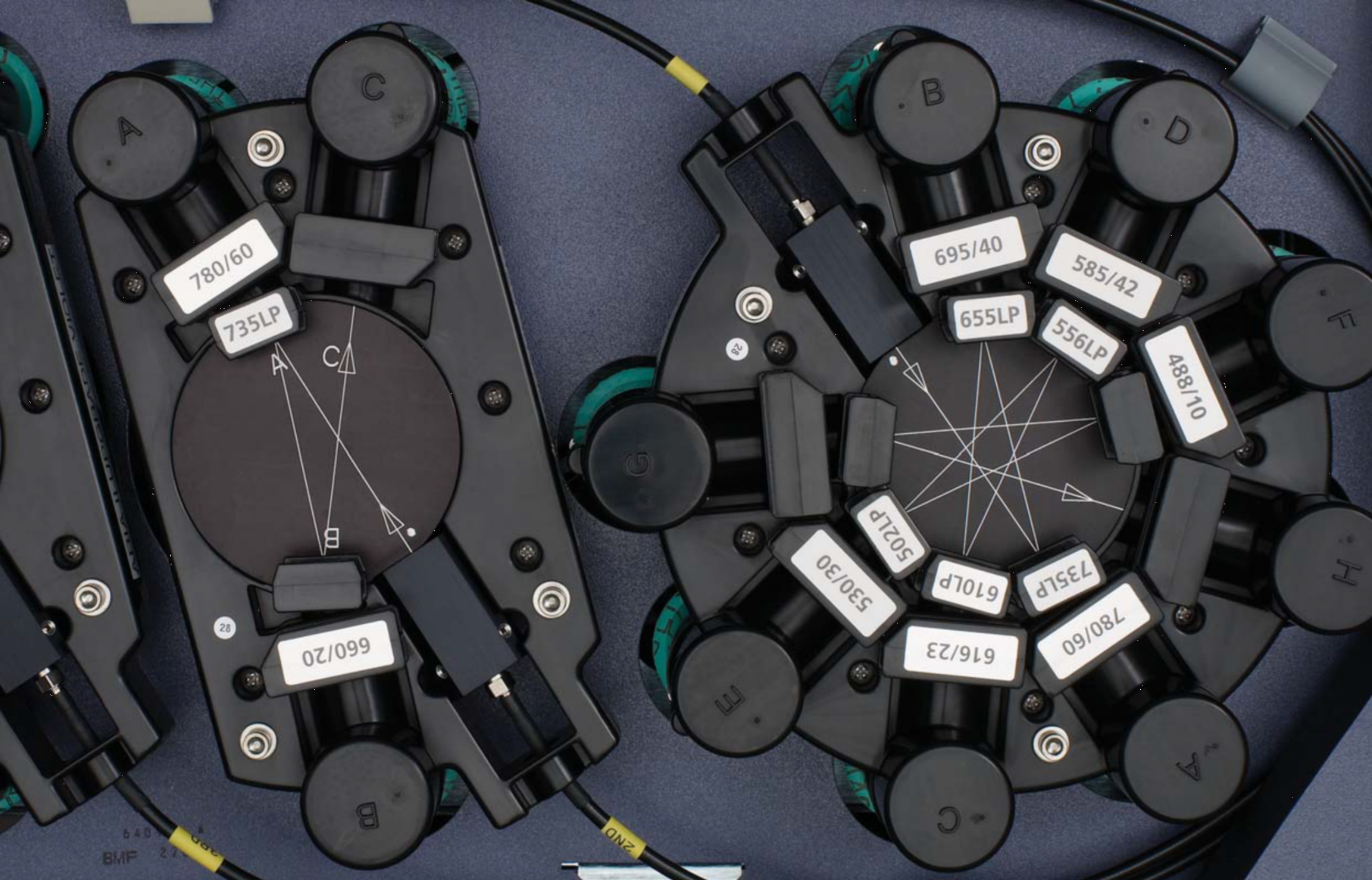 三角型和八角形信号收集系统 该收集系统能够最大限度的检测来自每个激光束照射点的信号,其原理是让最长是光优先投射进入第一个光电倍增管(PMT),并通过一系列长通二色分光镜将短波长的光反射到下一个PNT检测器。 联系人 :李博 联系电话:1357204884