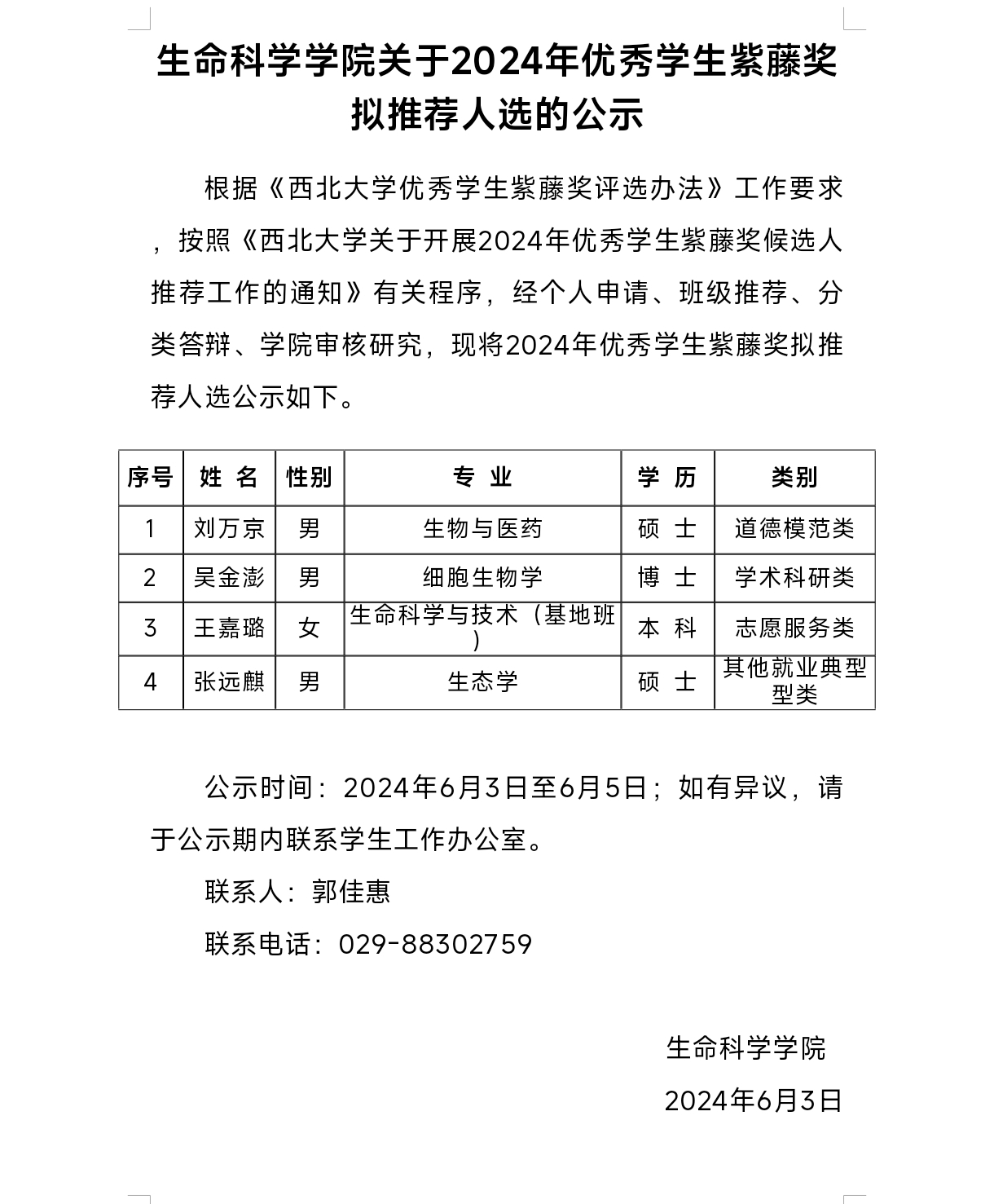 生命科学学院关于2024年优秀学生紫藤奖拟推荐人选的公示