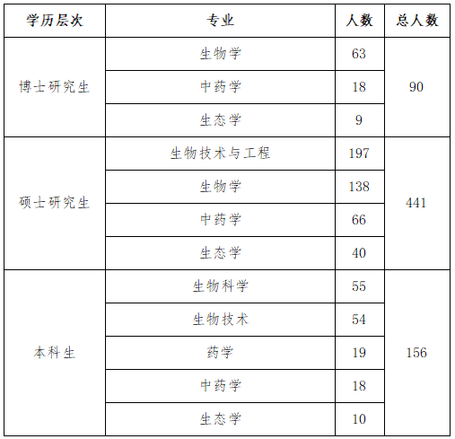 衷心感谢贵单位一直以来对学校毕业生就业工作的大力支持!我校生命科学类(生物学、药学、中药学、生态学、生物技术与工程)2025届预计毕业总人数为680余人,其中本科150余人、硕士400余人、博士90人。