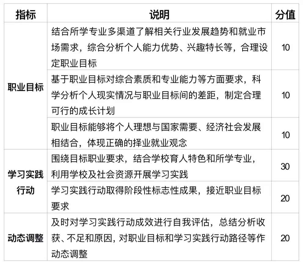 面向本科一、二、三年级学生。重点考察生涯发展理念的树立和职业目标的设定,围绕实现目标持续行动并不断调整的成长过程,通过学习实践提升综合素质与专业能力,体现正确的择业就业观念。