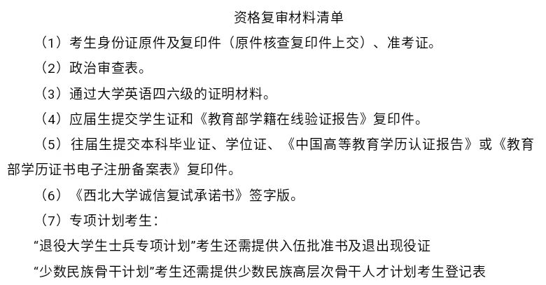 根据教育部和陕西省硕士研究生招生录取相关文件精神,以及《西北大学2025年硕士研究生复试录取工作办法》,结合我院实际,特制定本方案。报考我院所有专业的考生须在复试前通过CET-4 考试(即CET-4 成绩不小于425 分),CET-4 成绩未达425 分的同学请勿参加复试。