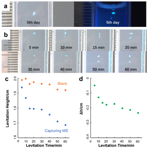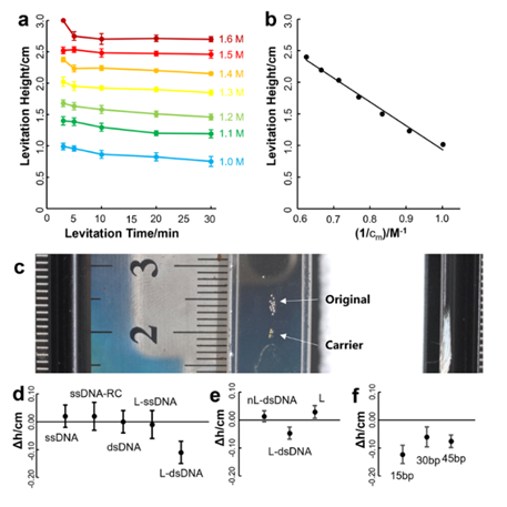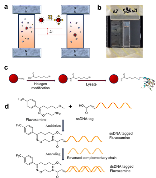 本研究报道了一种基于亲和磁悬浮的DELs筛选及检测新策略。该策略将药物-靶蛋白相互作用的特异性与磁悬浮原理的高磁性/密度敏感性相融合,设计了应用于简单固定化靶标的可视化中靶检测方法。以5-羟色胺转运体(5-HTT)和其特异性配体氟伏沙明为例,靶蛋白通过生物正交反应固定于聚苯乙烯微球表面作为筛选和检测载体;用该载体捕获DNA编码的氟伏沙明,与空白载体相比,在磁悬浮系统中发生了明显的高度变化(图1)。