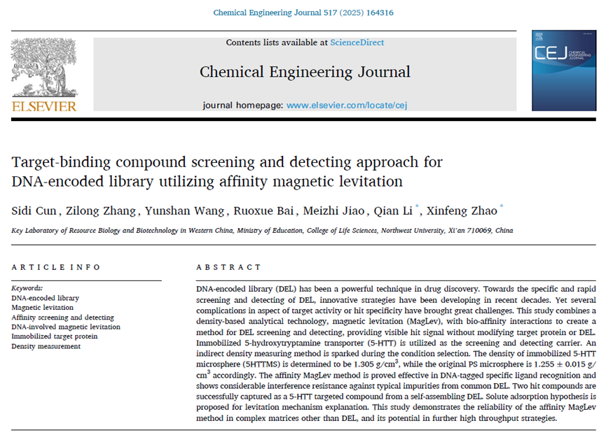 近日,437437必赢国际网址李倩/赵新锋团队在国际工程技术权威杂志Chemical Engineering Journal(中科院1区Top)在线发表了题为“Target-binding Compound Screening and Detecting Approach for DNA-encoded Library Utilizing Affinity Magnetic Levitation”的研究论文,报道了一种基于亲和磁悬浮技术的DNA编码化合物库筛选与检测方法。