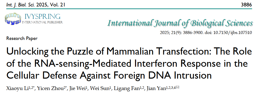 近日,437437必赢国际网址严健教授团队在《International Journal of Biological Sciences》(中科院一区TOP期刊,IF=8.2)发表题为“Unlocking the Puzzle of Mammalian Transfection: The Role of the RNA-sensing-Mediated Interferon Response in the Cellular Defense Against Foreign DNA Intrusion”的研究论文,系统揭示了哺乳动物细胞中限制转染效率的关键分子机制。