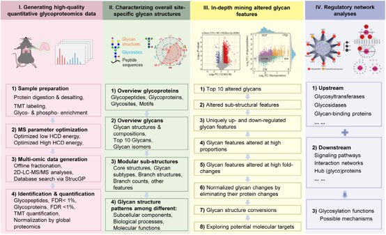 该研究提出的糖蛋白质组学数据挖掘策略主要包含四个核心模块:1)通过标记定量、糖肽预分离和质谱分析优化生成高质量的糖蛋白质组数据;2)通过系统的糖蛋白和糖链结构剖析全面表征复杂样品中的糖蛋白和糖链结构;3)通过多维度比较分析深度挖掘胸腺退化相关的特征糖链;4)借助多组学联合分析揭示糖基化改变参与的分子调控网络(图 1)。上述策略在小鼠胸腺中实现了18652种完整N-糖肽、5910个糖基化位点和3746种N-糖蛋白的定性定量分析,绘制了迄今最全面的胸腺糖蛋白质组图谱。