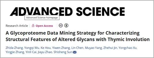 近日,437437必赢国际网址孙士生教授团队在Advanced Science发表了题为“A Glycoproteome Data Mining Strategy for Characterizing Structural Features of Altered Glycans with Thymic Involution”的研究论文。该论文提出了一套适用于结构糖蛋白质组学深度分析的大数据挖掘策略,并应用于胸腺退化研究。该研究首次揭示了小鼠胸腺退化过程中N-糖基化的全景图谱和关键糖基化变化,为深入理解免疫衰老提供了全新的糖生物学视角。