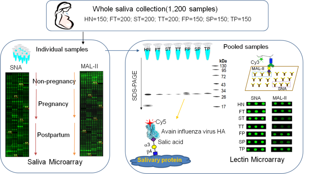 怀孕被认为是导致禽流感病毒易感的一个重要因素,世卫组织在2012年首次建议,应将妊娠期女性作为优先考虑的重要风险群体。妊娠期女性处于特殊的生理阶段,在这一时期人体免疫系统发生了较大改变,蛋白糖基化修饰尤其是位于糖链末端的唾液酸分子在众多的免疫过程中发挥着重要的调节作用。该研究揭示随着妊娠期的发展,唾液中的糖蛋白糖链表达发生了显著变化,妊娠中、晚期女性唾液中MUC5B、 SIgA等糖蛋白糖链上α2-3唾液酸表达水平下降是造成该群体禽流感易感的原因之一,这一结果将为妊娠期女性等禽流感易感人群的筛查及有效防护提供新的思路。