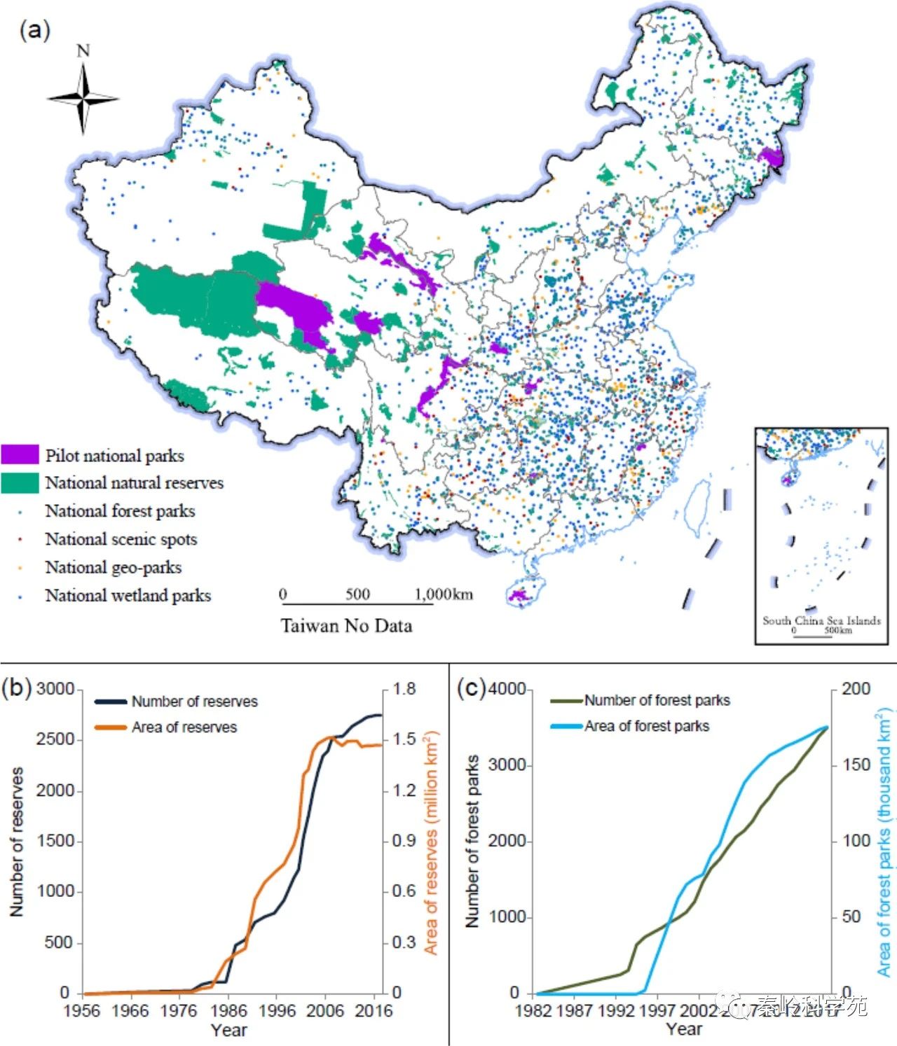 中国保护区分布区域及数量变化(图片:Huang et al. 2021)