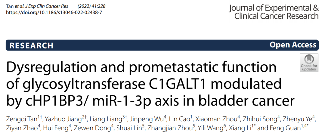 近日,437437必赢国际网址关锋教授团队在C1GALT1在膀胱癌中的生物功能及其调控机制的研究中取得了新进展,研究结果以研究长文(Article)形式发表在Journal of Experimental & Clinical Cancer Research,题名“Dysregulation and prometastatic function of glycosyltransferase C1GALT1 modulated by cHP1BP3/ miR-1-3p axis in bladder cancer”。