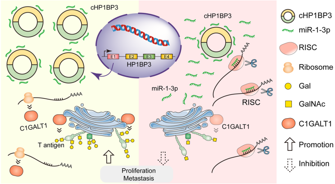 在O-糖链(O-GalNAc)的合成过程中,C1GALT1负责将Gal以β1-3糖苷键连接在GalNAc-Ser/Thr残基上,形成T抗原,而在癌症发生发展过程中, C1GALT1表达的异常会改变蛋白质的糖基化修饰水平,进而影响蛋白质的功能及结构。该研究发现,在膀胱癌的发生发展过程中C1GALT1含量显著升高,C1GALT1显著促进膀胱癌的增殖及迁移能力;C1GALT1的含量受到非编码RNA hsa-miR-1-3p及circRNA(cHP1BP3)的调控,hsa-miR-1-3p能够特异性的结合在C1GALT1 mRNA的3’ UTR区抑制C1GALT1表达,而cHP1BP3能够通过吸附hsa-miR-1-3p间接调控C1GALT1的表达;此外,通过糖蛋白质组学手段,发现C1GALT1能够改变Mucin16蛋白的糖基化修饰调控靶蛋白的稳定性,调节膀胱癌细胞的恶性表型。