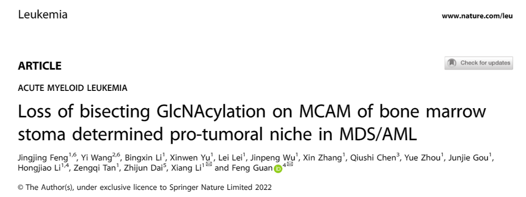 近日,437437必赢国际网址关锋/李想教授团队在基质细胞中bisecting GlcNAc影响黏附因子MCAM表达并重塑骨髓增生异常综合征(MDS)或急性髓系白血病(AML)骨髓微环境的机制研究中取得新进展。研究结果以研究长文(Article)形式发表在血液肿瘤学权威期刊《Leukemia》杂志上,题名为"Loss of bisecting GlcNAcylation on MCAM of bone marrow stoma determined pro-tumoral niche in MDS/AML"。