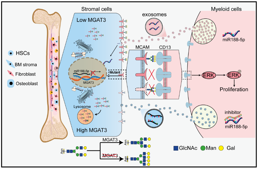 该研究表明恶性克隆细胞通过释放外泌体传递到骨髓基质细胞,改变骨髓基质细胞糖基化修饰,从而创造利于自身存活的骨髓微环境。这些结果将为深入研究糖链参与骨髓造血微环境对MDS/AML克隆细胞的增殖作用奠定研究基础。