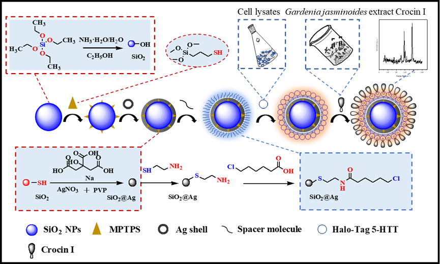 作者将6-氯己酸修饰于一种表面增强核壳SiO2@Ag纳米材料表面,将含有卤代烷烃脱卤素酶标签(Halo Tag)的5-HTT细菌裂解液与SiO2@Ag纳米材料混合,通过Halo Tag与卤代烷烃间的脱卤素反应,将5-HTT一步共价固定于SiO2@Ag纳米材料表面,制备双功能亲和选择性SERS探针,并应用于中药栀子的靶向活性成分筛选(图1)。该方法的优势体现在以下三个方面:1)探针灵敏度高,且能在数分钟内快速检测目标活性成分;2)蛋白固定化过程利用了生物正交反应,避免了繁杂耗时的蛋白分离纯化步骤,固定化蛋白质活性更高;3)该方法特异性强,稳定性好,具有一定的通用性,可为其他中药活性成分筛选提供借鉴。