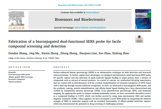 近期,西北大学赵新锋和李倩团队将固定化蛋白质与SERS技术相结合,首次建立了一种基于固定化五羟色胺转运体(5-HTT)的双功能亲和选择性SERS探针,并成功应用于栀子提取液中靶向活性成分的筛选与检测研究。相关成果以“Fabrication of a bioconjugated dual-functional SERS probe for facile compound screening and detection”为题发表在Biosensors and Bioelectronics上。(DOI: 10.1016/j.bios.2023.115369)